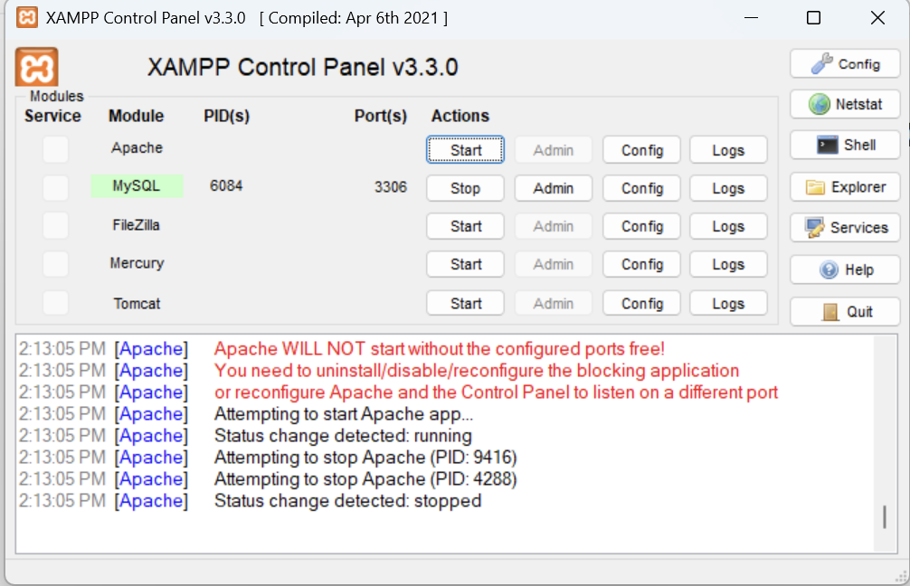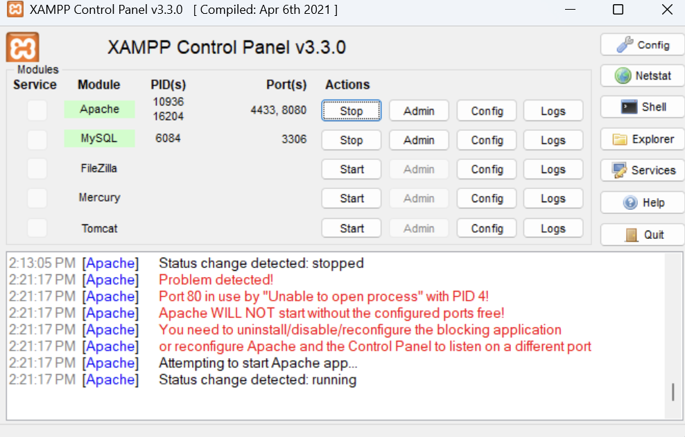 - พอ install เสร็จเปิด xamp contronllorขี้น มาและกด apache กับ mysql start ส่วนใหญ่จะติด error กดstart apache ไม่ได้ ดังภาพ (พอกดstart แล้วมันแจ้ง errorสีแดงดังภาพด้านล่าง)