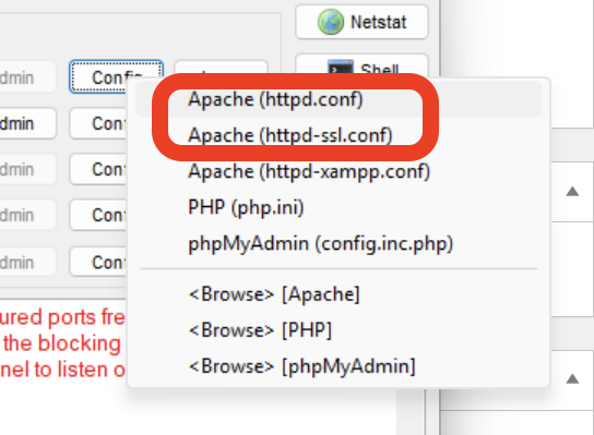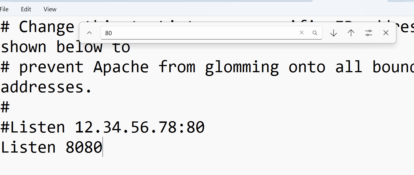 - วิธีแก้ให้กด config ตรง apache แล้วเลือก apache (httd.conf) แล้วกด ctrl+f ค้นหา 80 แล้วแก้ไข LISTEN:80 เป็น LISTEN:8080 ดังภาพแล้วกด save