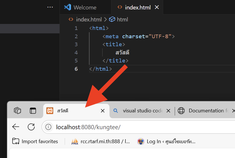 <html> <meta charset="UTF-8"> <title> <!--แสดงบน tab บน browser แสดงว่าหน้านั้นคืออะไรกำลังเปิดหน้าอะไรอยู่--> สวัสดี </title> <head> <!--css เป็นไฟล์สำหรับแสดงผลความสวยงามการจัด object ให้มี design ที่ต้องการ--> <!--java script เป็นไฟล์สำหรับใช้คำสั่งให้เว็บทำงานได้ตามต้องการเช่นการ alert การตรวจสอบ object --> </head> <body> <!--แสดงผลตรง content ในหน้าจอ--> </body> </html>12. การนำภาพและข้อความมาใส่ในเว็บไซต์