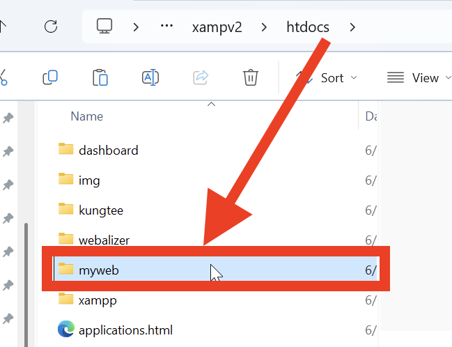 เอาโฟลเดอร์ด้านบนไปวางไว้ที่ htdocs แล้วแก้ไขชื่อโฟลเดอร์เป็น myweb (คลิกขวาที่โฟลเดอร์wordpress แล้ว rename)