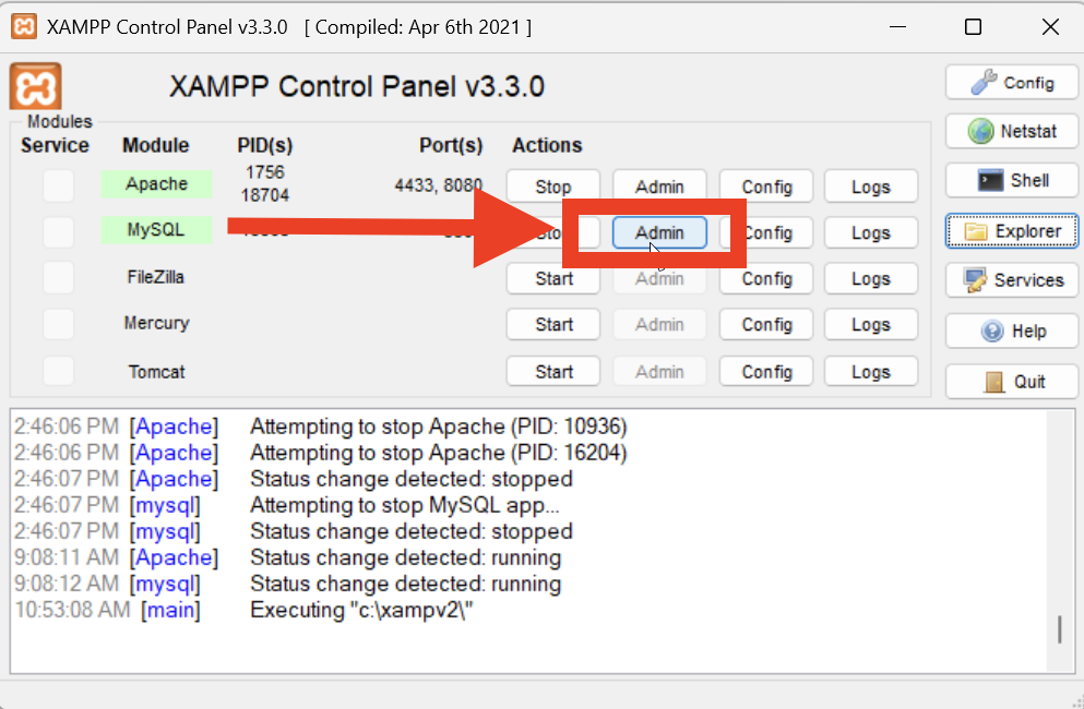 ขั้นตอนการสร้าง database ให้ไปที่ xampp control panel ไปที่ msql กดปุ่ม admin