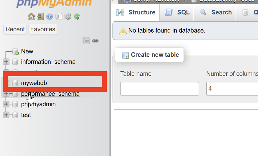 ตั้งชื่อว่า mywebdb แล้วกด create เราจะได้ database mywebdb ดังภาพ