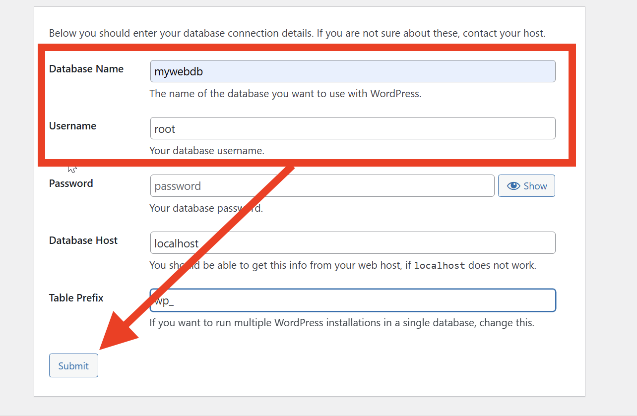 database name ใส่ mywebdb และ username ใส่root แล้วกด submit ดังภาพ