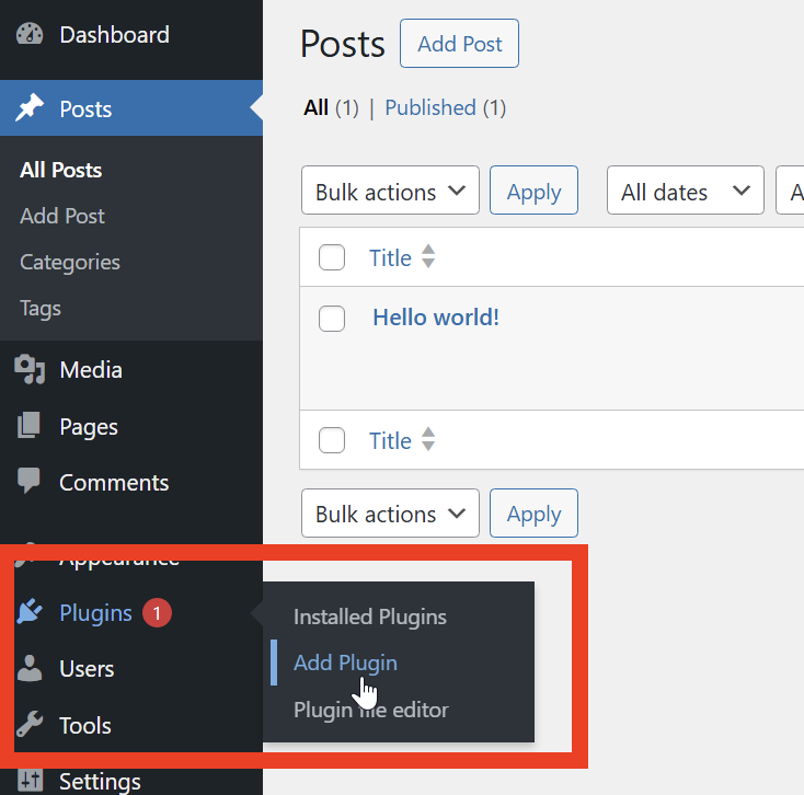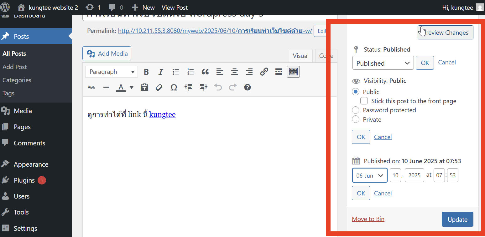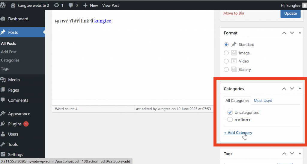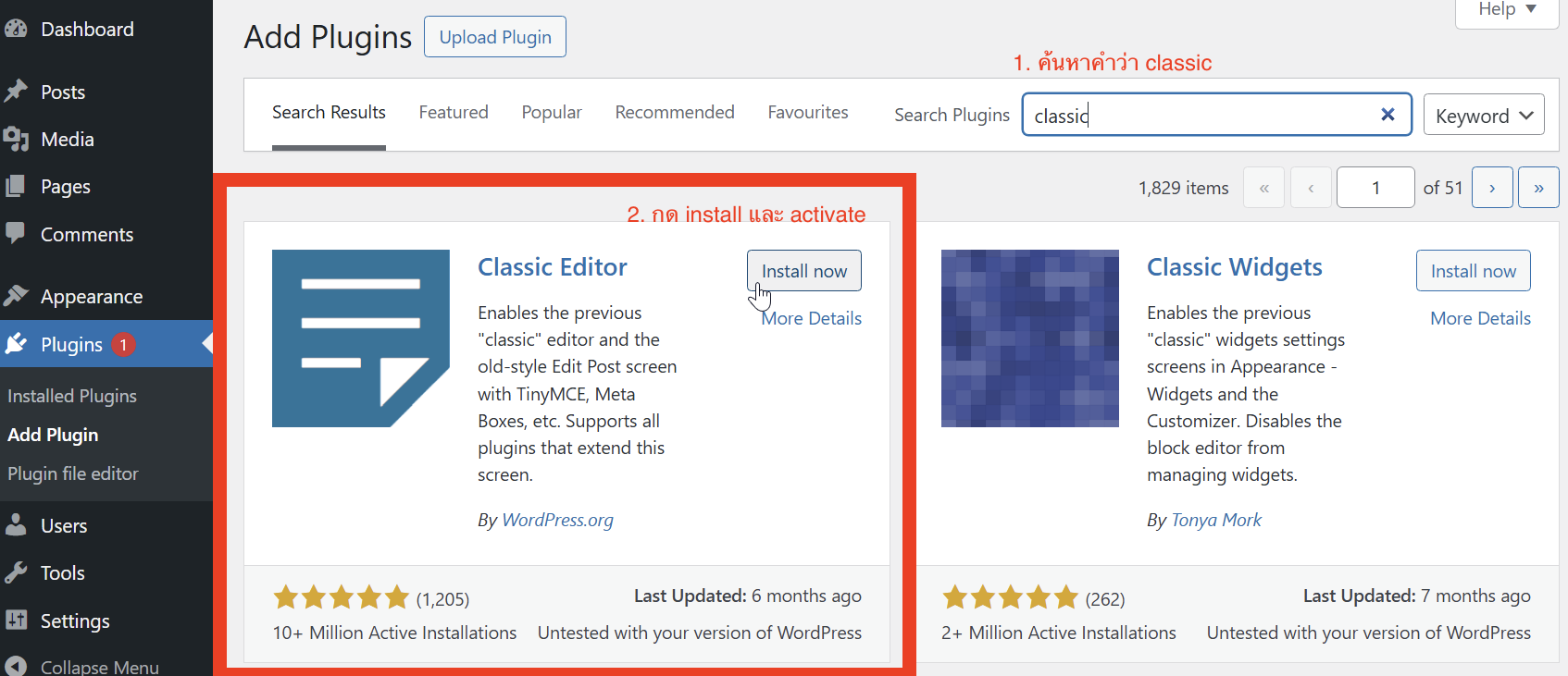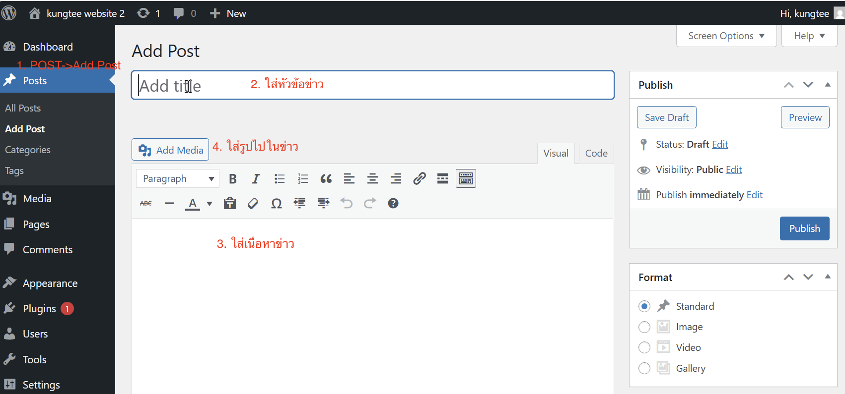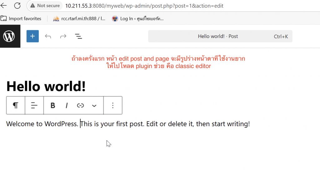 กลับมาหลังบ้าน แล้วไปที่เมนู post แล้วเลือก hello world แล้วกดปุ่ม editหลังจากนั้นกลับไปที่เมนู post แล้วลอง add post หรือแก้ไข post เดิมดู จะเจอหน้าจอแบบ classic ใช่งานง่ายดังภาพ