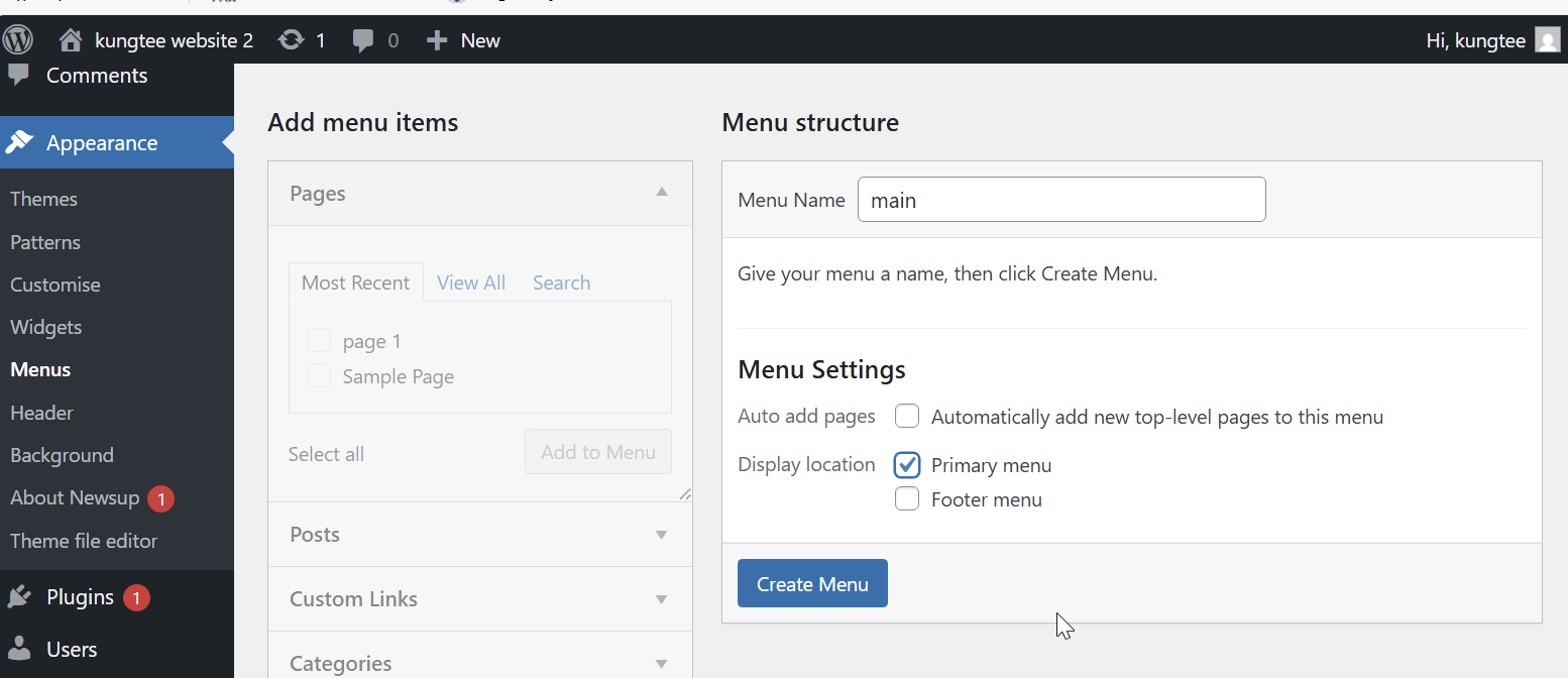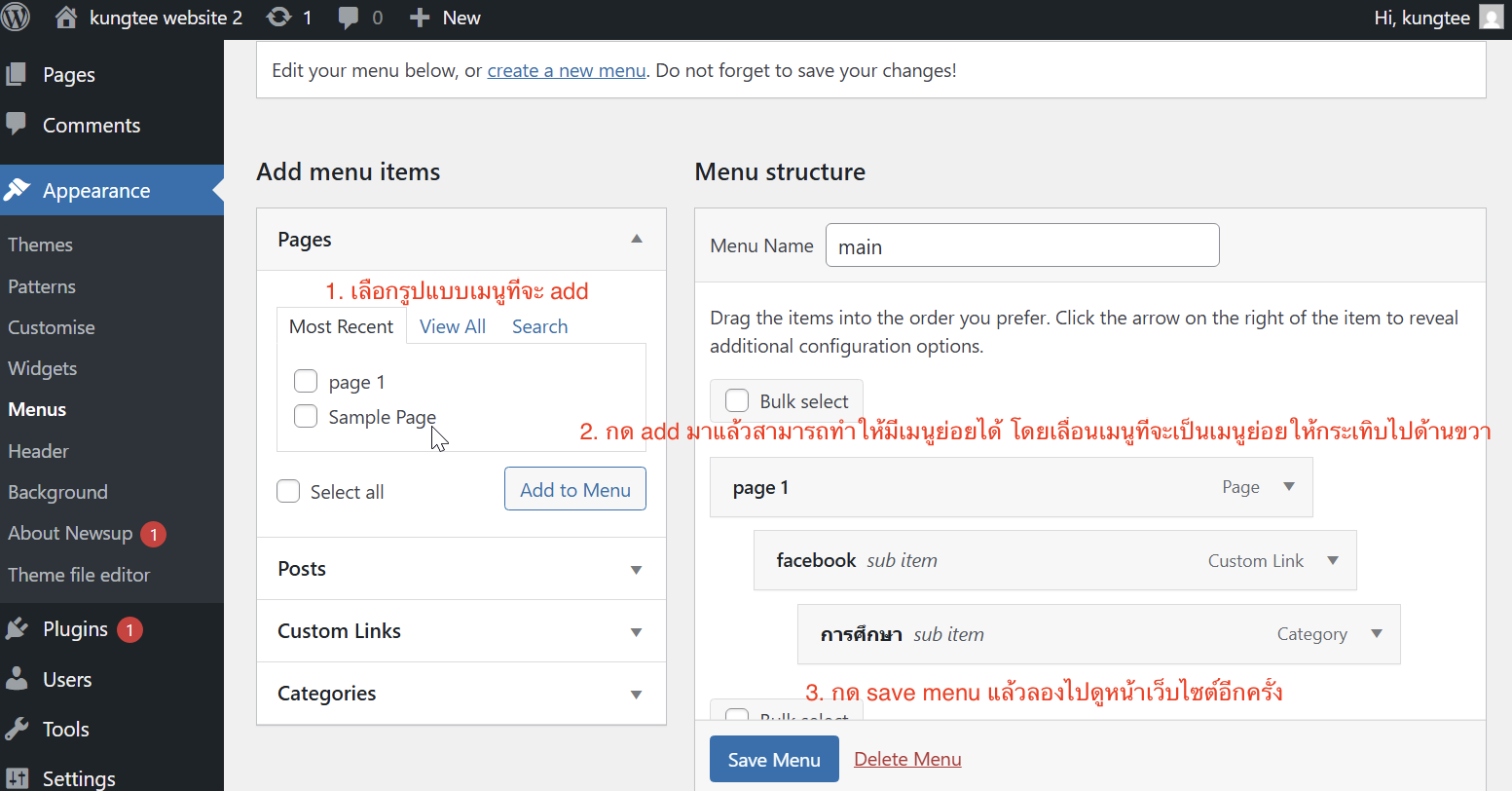 การสร้างเมนูไปที่ appearance ไปที่เมนู แล้วสร้าง main manu เป็น main เลือก primaryพอกดที่เมนู page1 จะมีเมนูย่อยให้เลือก