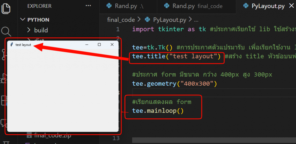 import tkinter as tk #ประกาศเรียกใช้ lib ใช้สร้างฟอร์ม tee=tk.Tk() #การประกาศตัวแปรมารับ เพื่อเรียกใช้งาน lib tk tee.title("test layout") #สร้าง title หัวข้อบนฟอร์ม #ประกาศ form มีขนาด กว้าง 400px สูง 300px tee.geometry("400x300") #เรียกแสดงผล form tee.mainloop()
