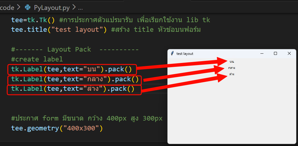 import tkinter as tk #ประกาศเรียกใช้ lib ใช้สร้างฟอร์ม tee=tk.Tk() #การประกาศตัวแปรมารับ เพื่อเรียกใช้งาน lib tk tee.title("test layout") #สร้าง title หัวข้อบนฟอร์ม #ประกาศ form มีขนาด กว้าง 400px สูง 300px tee.geometry("400x300") #เรียกแสดงผล form tee.mainloop()