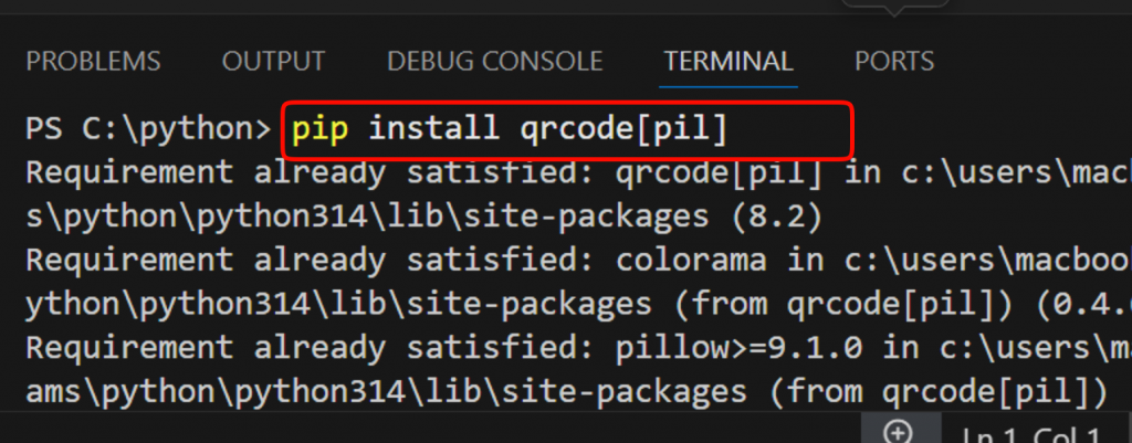 เปิด terminal (command promp บน VScode) แล้วพิมพ์ pip install qrcode[pil]