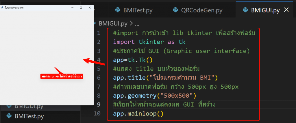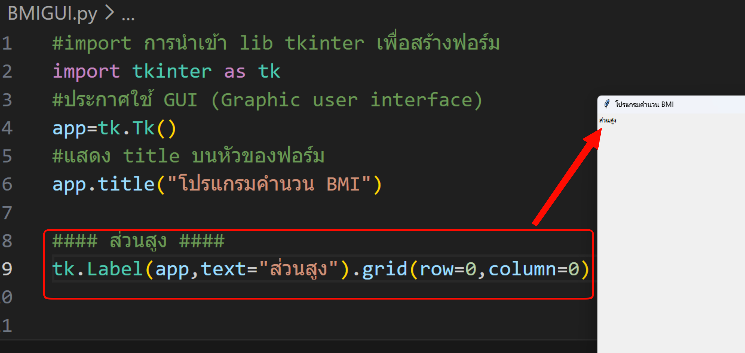 #import การนำเข้า lib tkinter เพื่อสร้างฟอร์ม import tkinter as tk #ประกาศใช้ GUI (Graphic user interface) app=tk.Tk() #แสดง title บนหัวของฟอร์ม app.title("โปรแกรมคำนวน BMI") #กำหนดขนาดฟอร์ม กว้าง 500px สูง 500px app.geometry("500x500") #เรียกให้หน้าจอแสดงผล GUI ที่สร้าง app.mainloop() - สร้าง Label ส่วนสูง