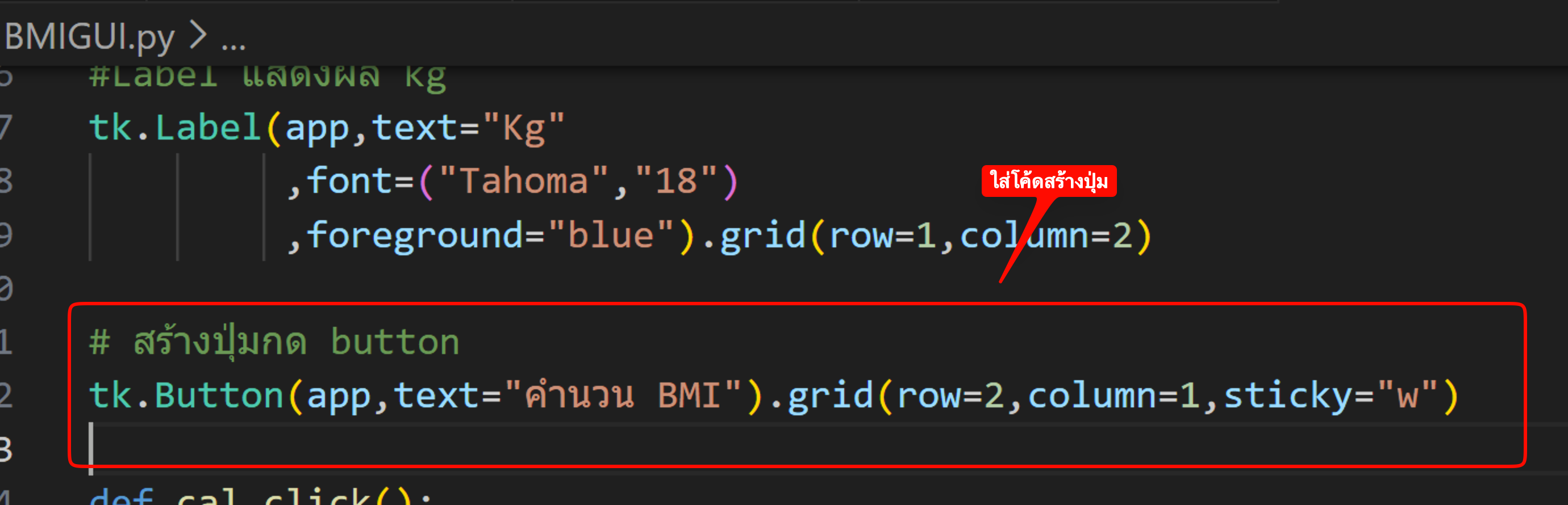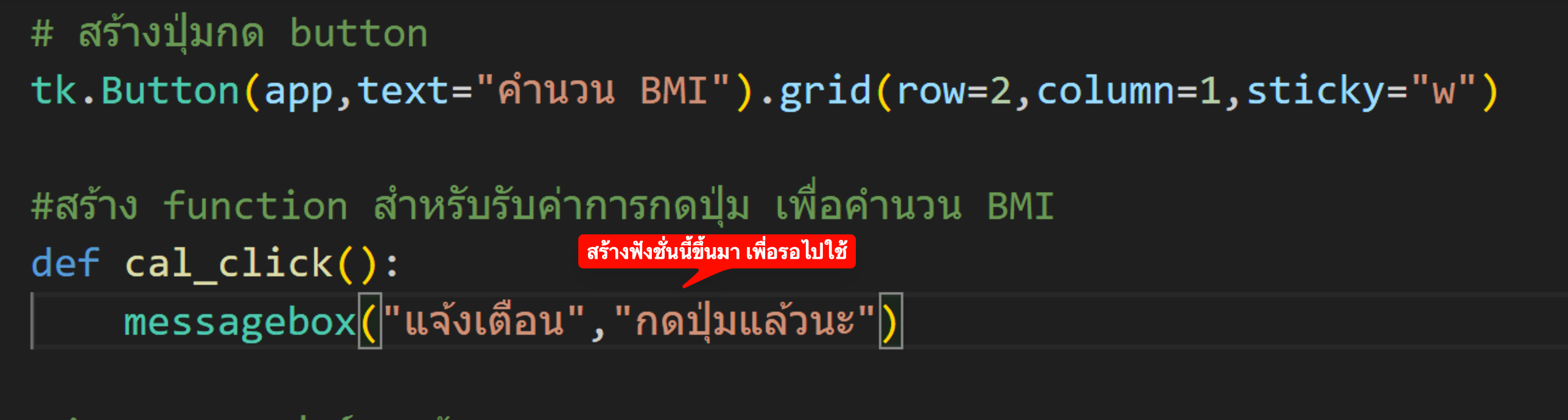 tk.Button(app,text="คำนวน BMI",command=cal_click).grid(row=2,column=1,sticky="w")