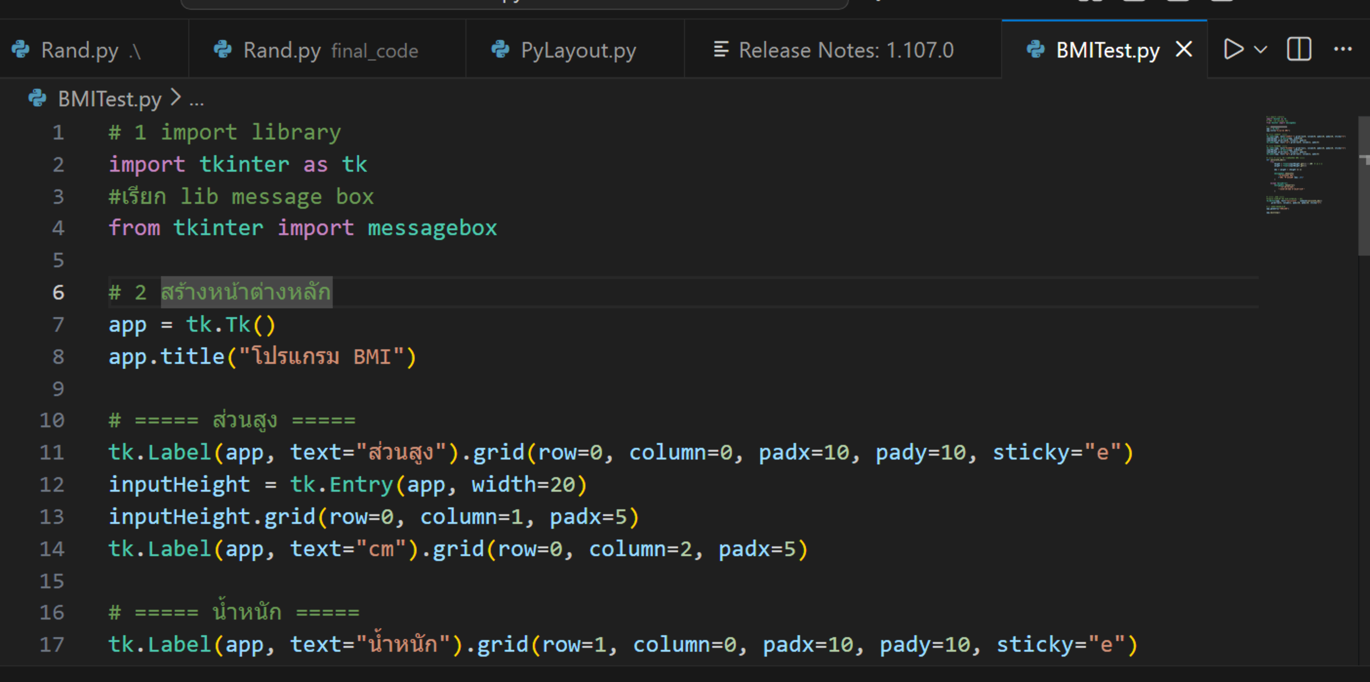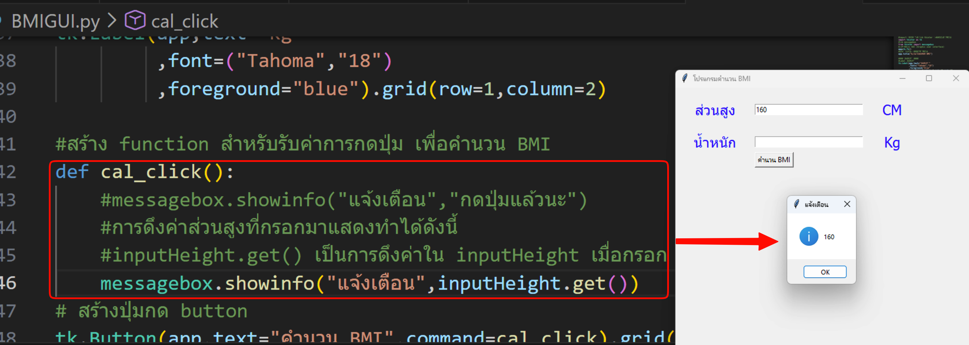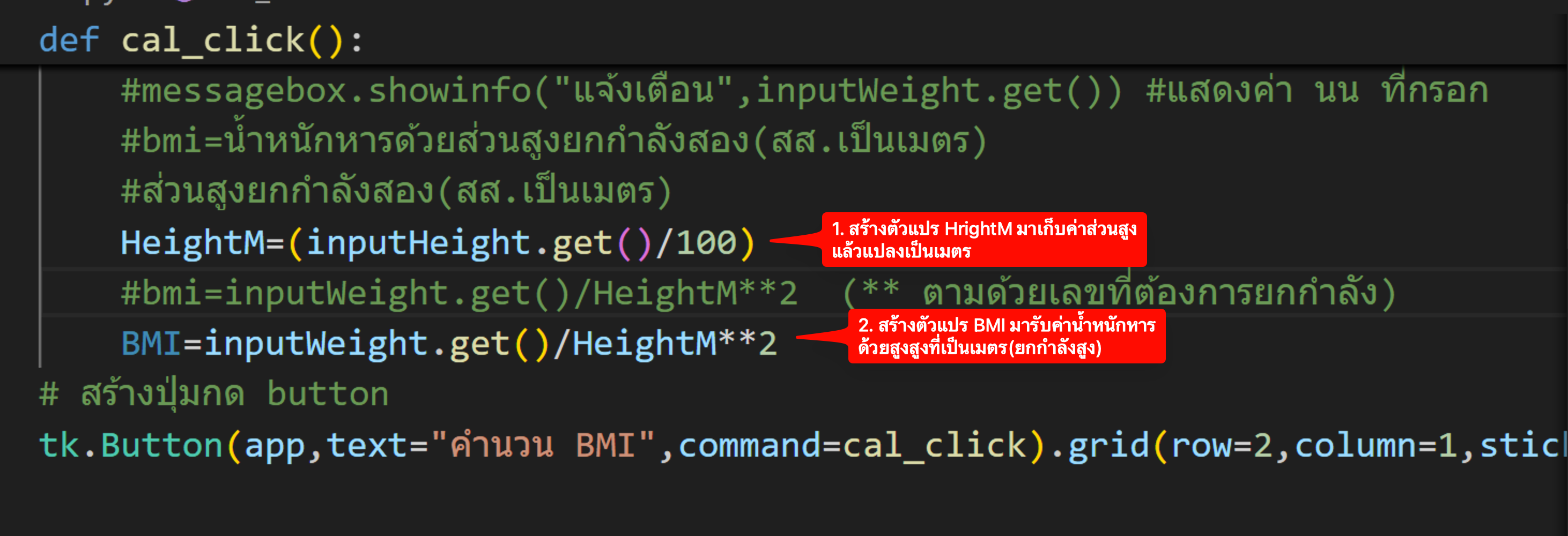 #import การนำเข้า lib tkinter เพื่อสร้างฟอร์ม import tkinter as tk #lib messagebox from tkinter import messagebox #ประกาศใช้ GUI (Graphic user interface) app=tk.Tk() #แสดง title บนหัวของฟอร์ม app.title("โปรแกรมคำนวน BMI") #### ส่วนสูง #### #Label ส่วนสูง tk.Label(app,text="ส่วนสูง" ,font=("Tahoma","18") ,foreground="blue" ).grid(row=0,column=0,padx=30,pady=20 ,sticky="e") #sticky คล้ายกับ anchor ของ pack โดยกำหนดทิศให้วัตถุไปจัดตามทิศนั้น #สร้าง input สำหรับกรอกข้อความส่วนสูงไป inputHeight=tk.Entry(app,width=30) inputHeight.grid(row=0,column=1) #Label CM tk.Label(app,text="CM" ,font=("Tahoma","18") ,foreground="blue" ).grid(row=0,column=2,padx=30,pady=20 ,sticky="w") ###### น้ำหนัก ##### #Label น้ำหนัก tk.Label(app,text="น้ำหนัก" ,font=("Tahoma","18") ,foreground="blue").grid(row=1,column=0) #input รับค่าน้ำหนักที่กรอก inputWeight=tk.Entry(app,width=30) inputWeight.grid(row=1,column=1) #Label แสดงผล kg tk.Label(app,text="Kg" ,font=("Tahoma","18") ,foreground="blue").grid(row=1,column=2) #สร้าง function สำหรับรับค่าการกดปุ่ม เพื่อคำนวน BMI def cal_click(): messagebox.showinfo("แจ้งเตือน","กดปุ่มแล้วนะ") # สร้างปุ่มกด button tk.Button(app,text="คำนวน BMI",command=cal_click).grid(row=2,column=1,sticky="w") #กำหนดขนาดฟอร์ม กว้าง 500px สูง 500px app.geometry("500x500") #เรียกให้หน้าจอแสดงผล GUI ที่สร้าง app.mainloop() - แก้ไขส่วนของฟังชั่น cal_click เมื่อกดคำนวนให้แสดงค่า inputHeight