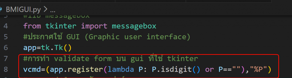 การใช้ validate form ของ tkinter ไปแก้ไขด้านบนตรง app=tk.Tk() เพิ่มโค้ดต่อดังภาพ