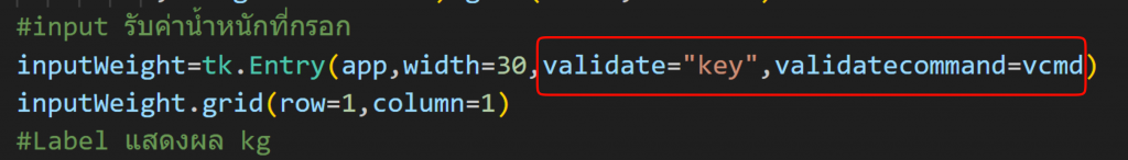 - การนำไปใช้กับ input ให้ไปแก้ไขที่ tk.Entry ที่มีการเรียกใช้ว่าอยากให้รับค่าเฉพาะตัวเลข ดังภาพ