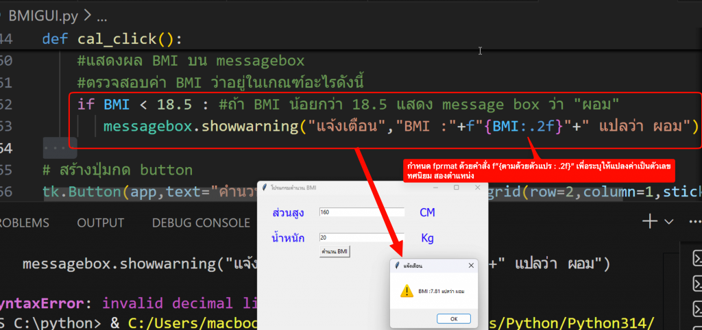 messagebox.showwarning("แจ้งเตือน","BMI :"+f"{BMI:.2f}"+" แปลว่า ผอม")
