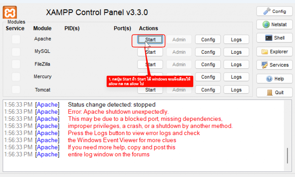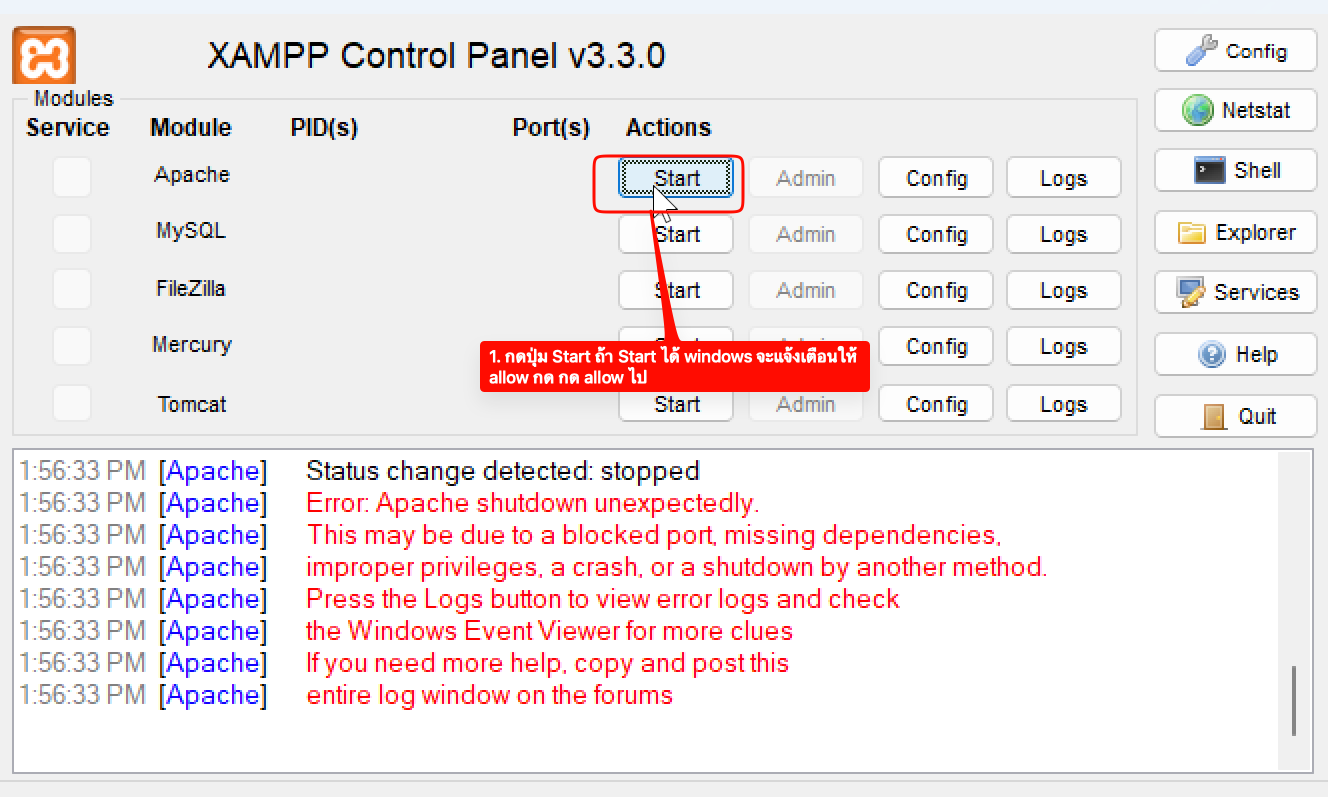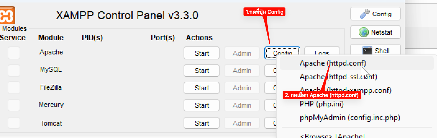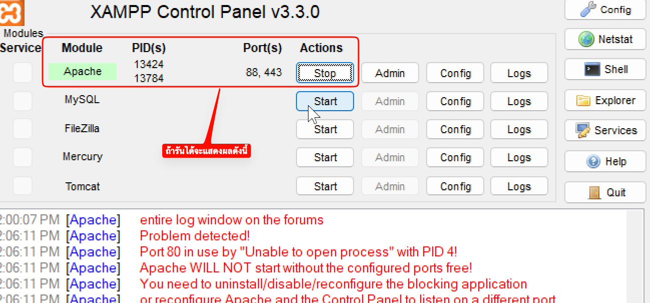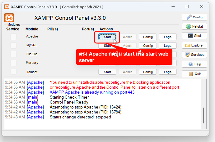 - กดปุ่ม start ตรง Apache เพื่อ run web server