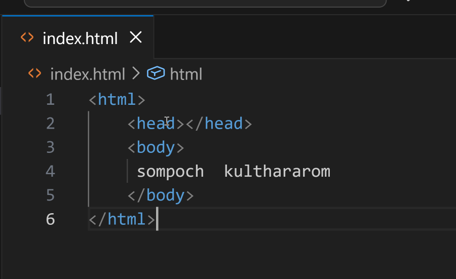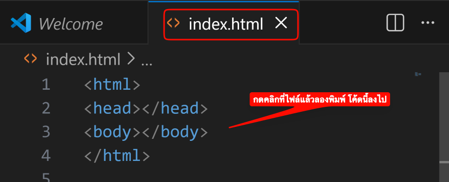 หลังจากนั้นกด คลิกขวาที่ไฟล์ index.html แล้ว open whith Visual Studio Code แล้วทำการพิมพ์โค้ด HTML ดังภาพ