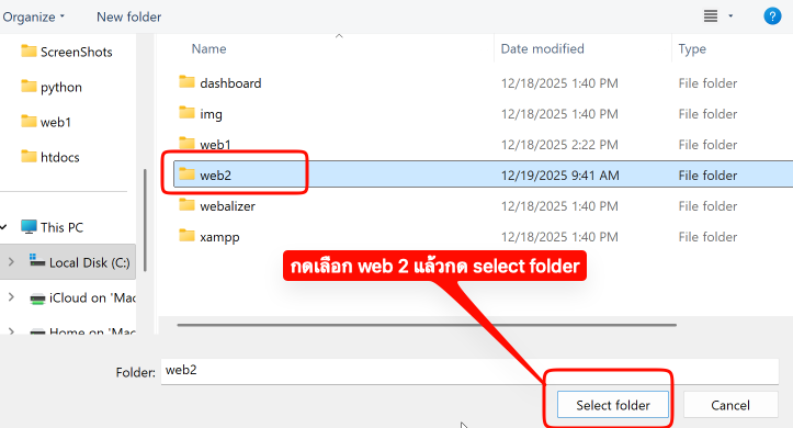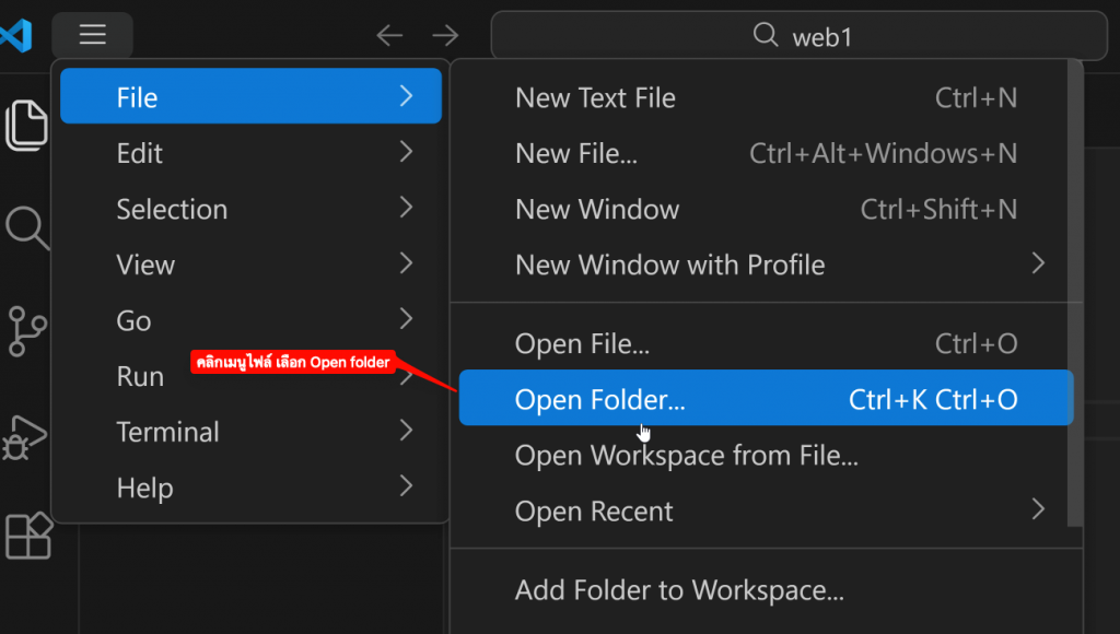 - หลังจากนั้นให้เปิดโปรแกรม Visual Studio Code แล้วเลือก File->Open Folder แล้วเลือก web2 ที่สร้าง