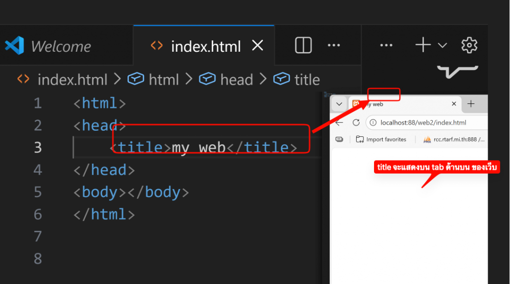 - ในส่วนของ Head ส่วนใหญ่จะประกอบไปด้วย title แสดงหัวข้อบน browser และเรียกพวก javascript หรือไฟล์ stylesheet (css)