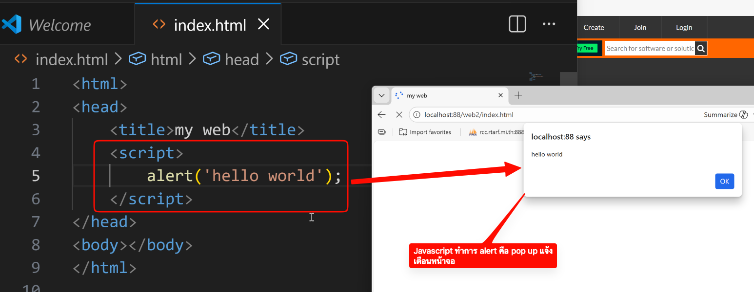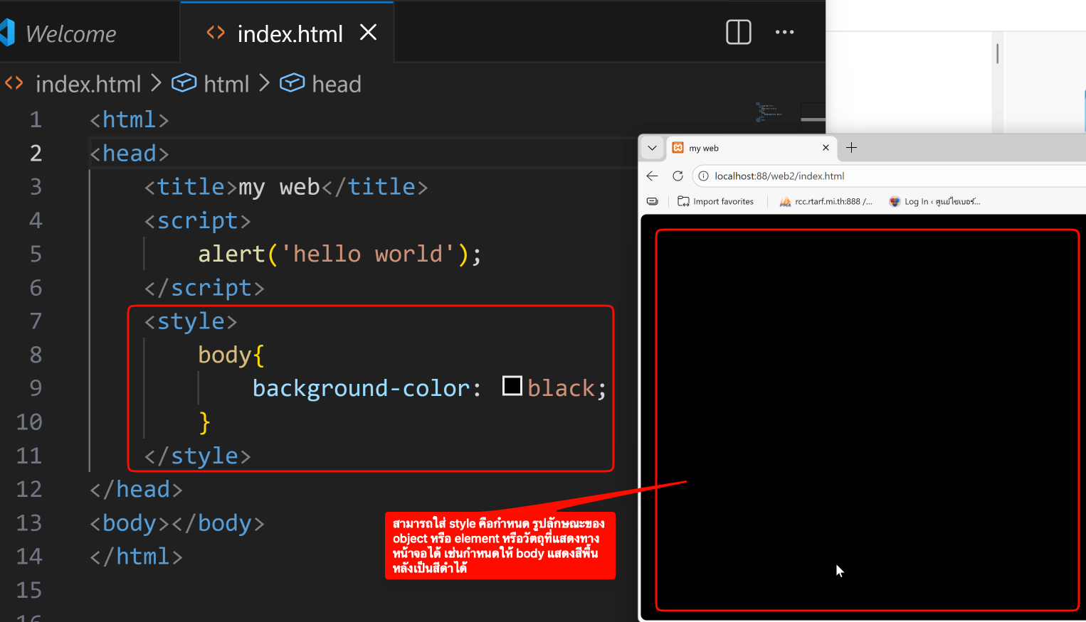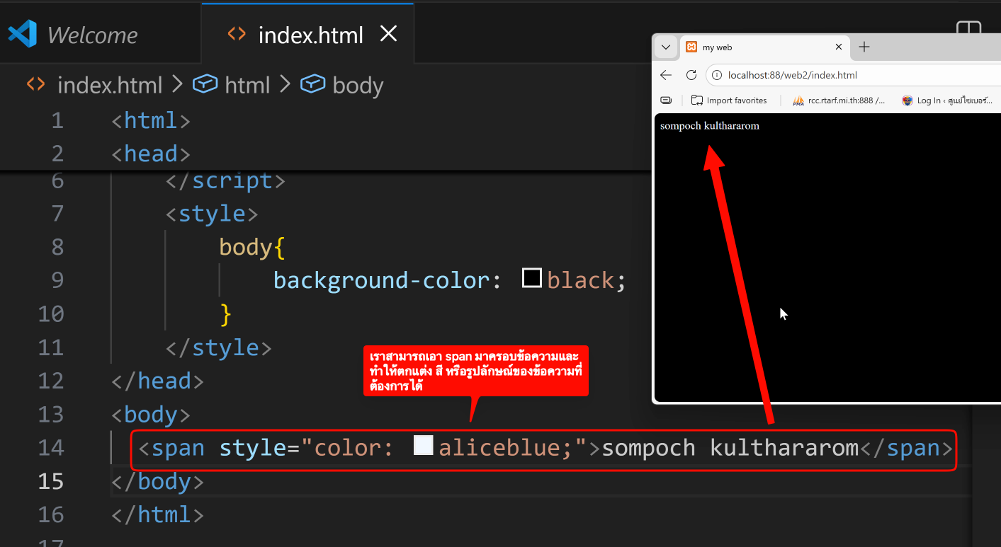 <html> <head> <title>my web</title> <script> alert('hello world'); </script> <style> body{ background-color: rgb(19, 238, 191); } </style> </head> <body> <span style="color: aliceblue;">sompoch <br> kulthararom</span> <p style="color: aliceblue;"> jlkjkljklj jghgkghghkgh </p> <div style="color:blueviolet"> <table> <tr> <td> row 1 col 1 </td> <td> row 1 col 2 </td> </tr> <tr> <td> row 2 col 1 </td> <td> row 2 col 2 </td> </tr> </table> </div> </body> </html> - เอารูป หรือไฟล์ ขึ้นหน้าเว็บทำได้ดังนี้