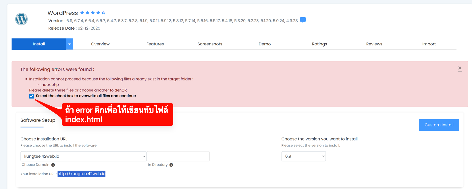 กรณีเจอปัญหา ติดตั้งไม่ได้เพราะมีไฟล์ index ต้องติดตามภาพแล้ว install อีกครั้ง