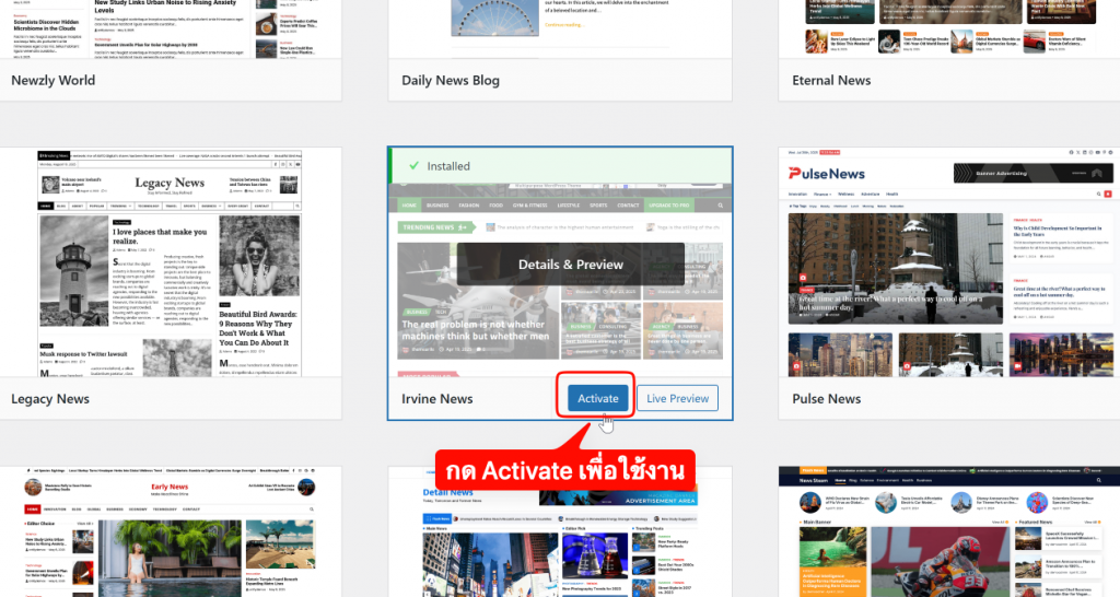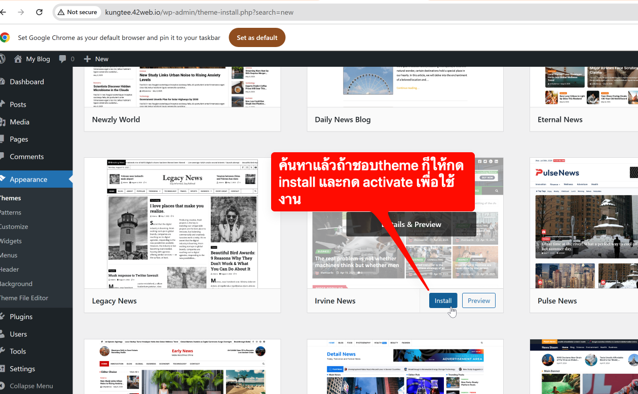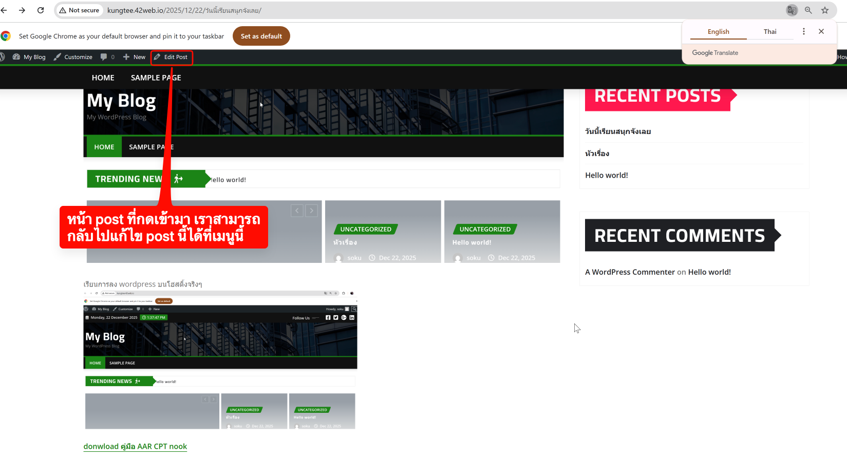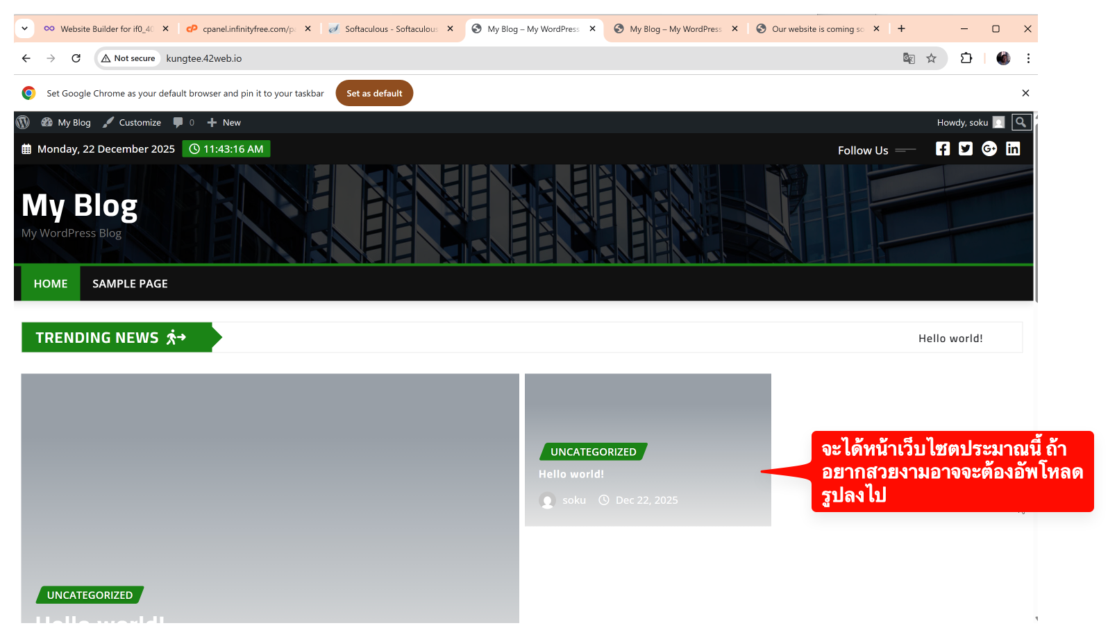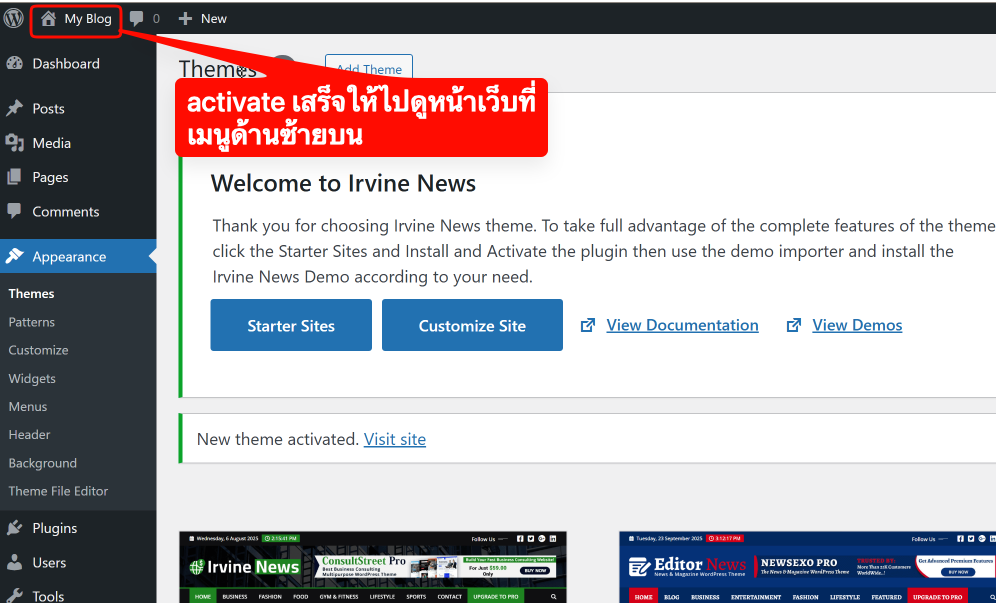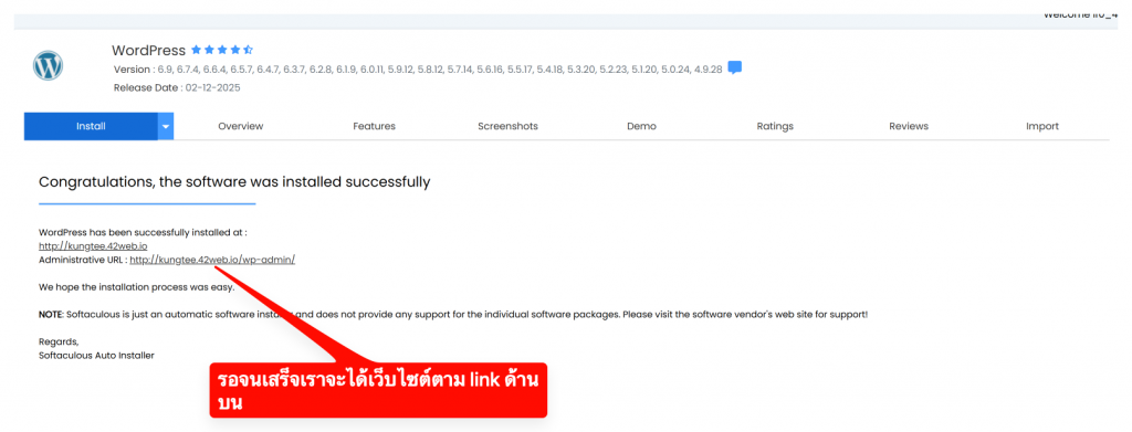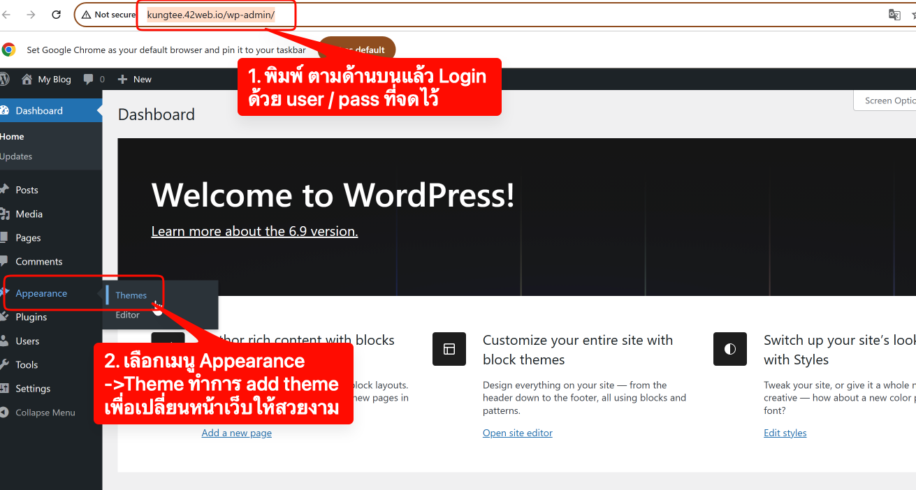 - หลังจากลงเว็บเสร็จเข้าไปหลังบ้านที่ http://ชื่อเว็บไซต์เราที่สร้าง/ wp-admin