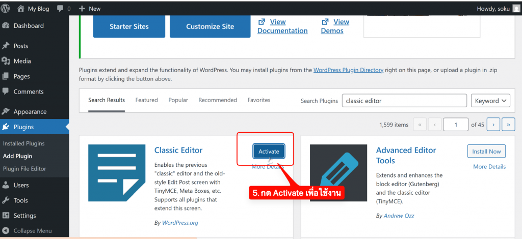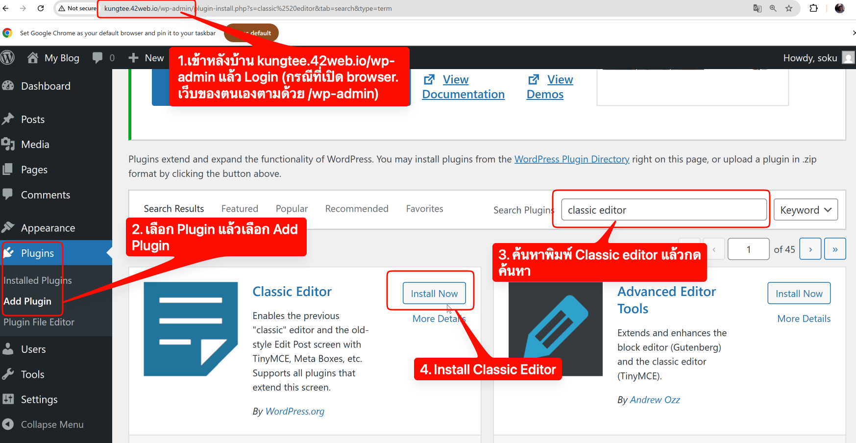 - ก่อนการจะ post เนื้อหาลงหน้าเว็บให้ทำการเพิ่ม plugin classic editor เพื่อให้ง่านในการโพสข้อมูลลงหน้าเว็บ
