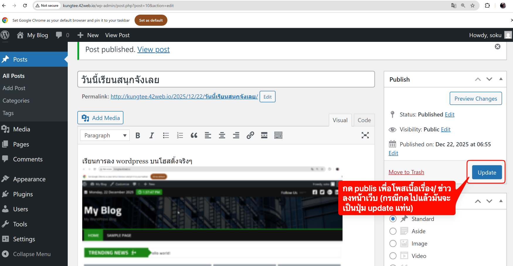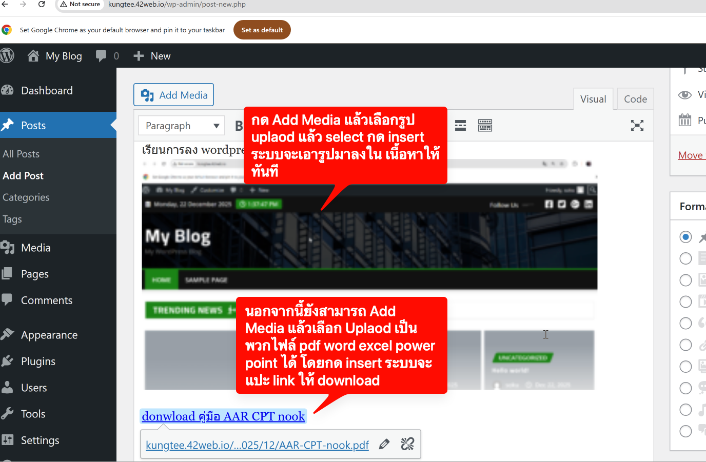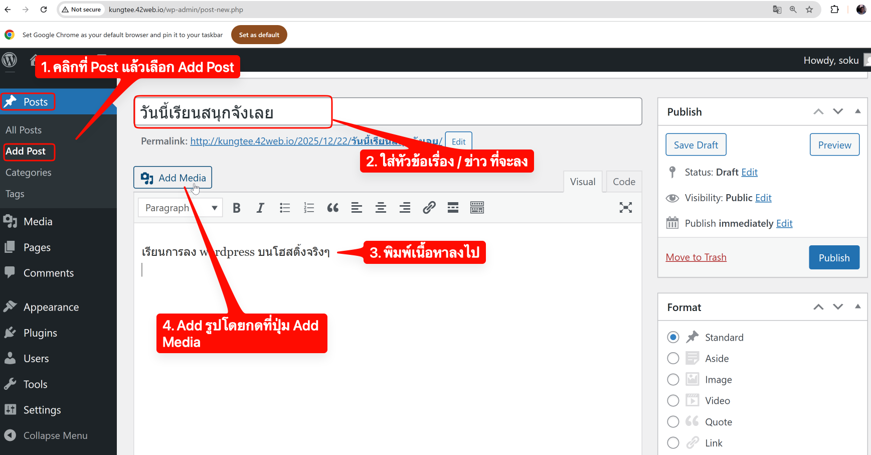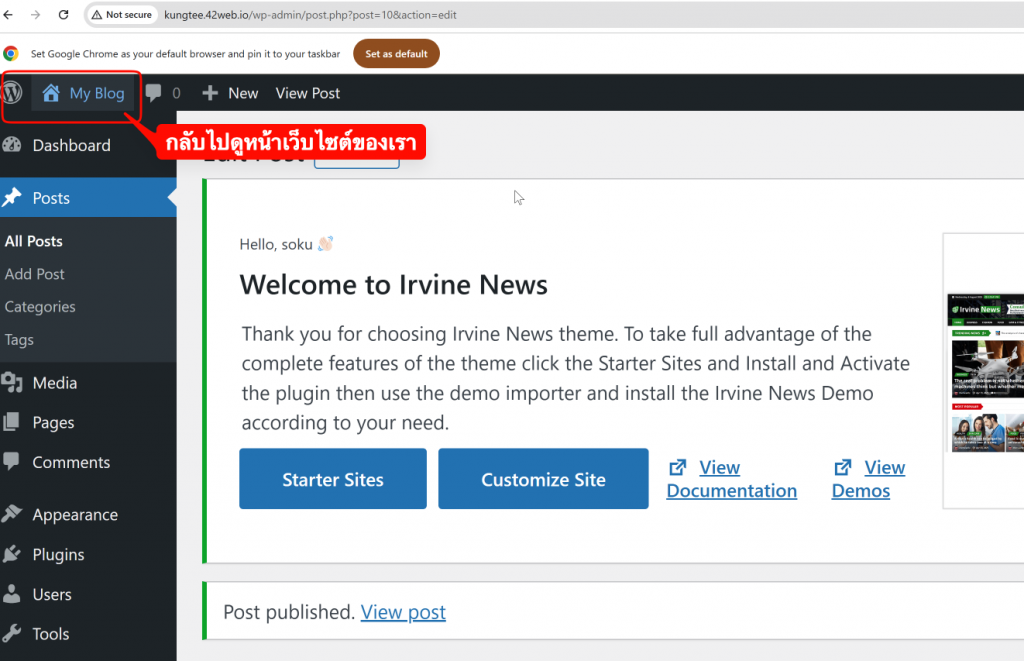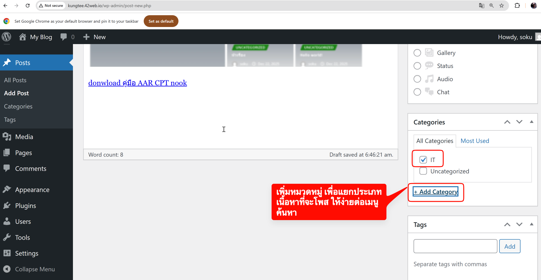 - ไปที่เมนู post หรือเมนูเรื่อง อีกครั้ง เพื่อทำการเพิ่มข้อมูล เรื่อง/ข่าว ลงหน้าเว็บไซต์