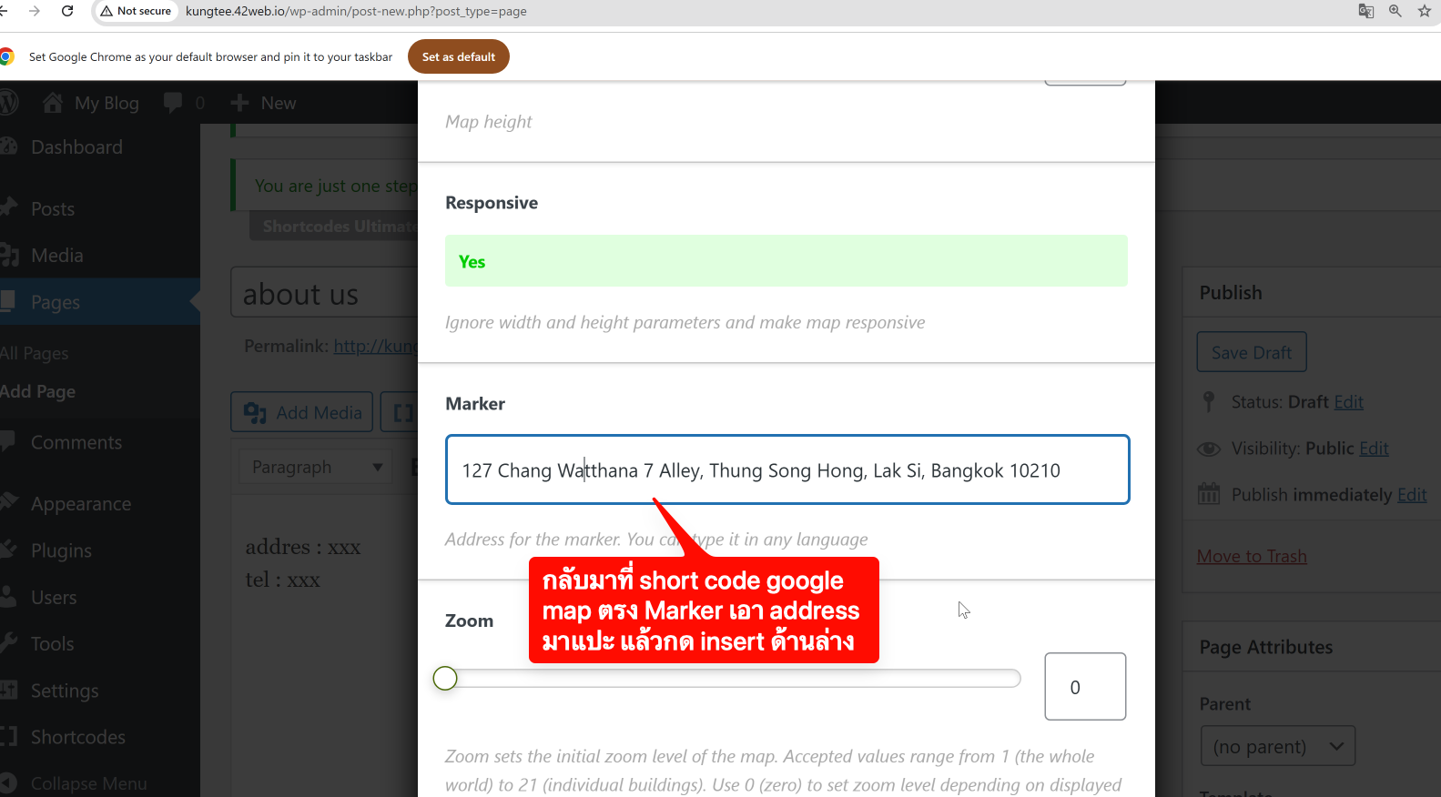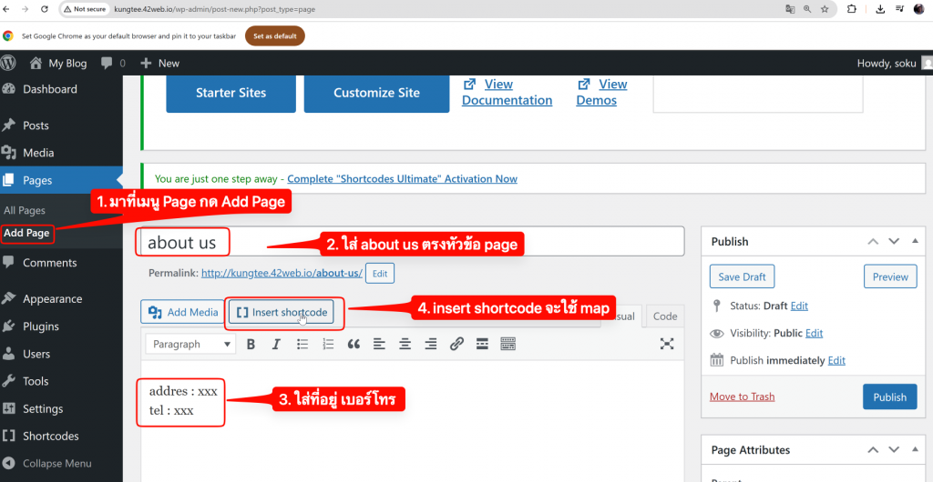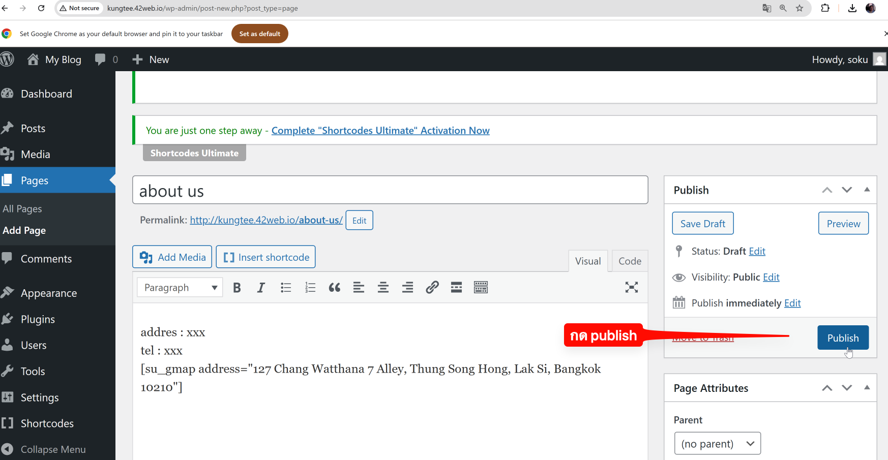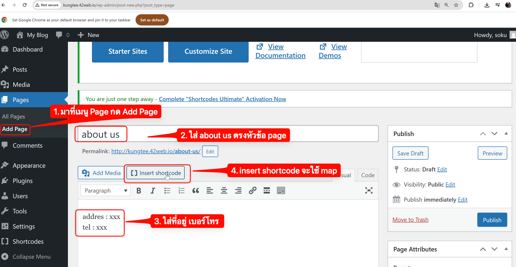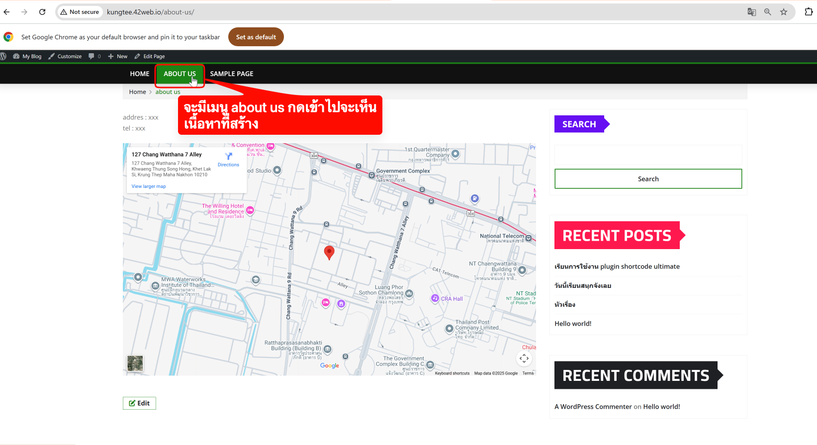 หลังจากนั้นกดดูหน้าเว็บ จะมีเมนู about us สำหรับบาง theme ต้องแก้เมนูเอง บาง theme จะมีมาให้ในเมนูเลย