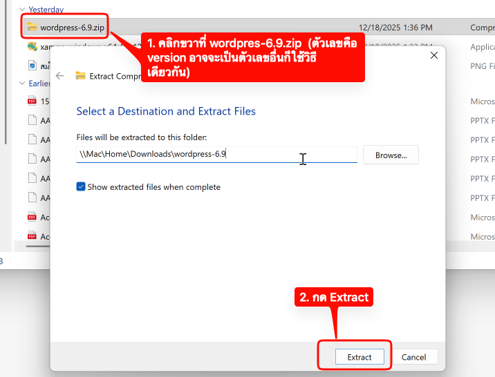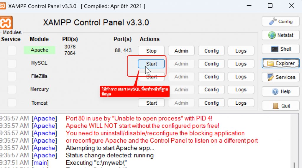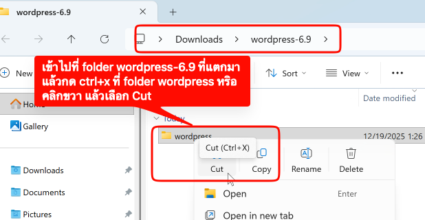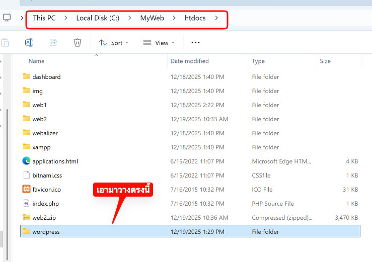 หลังจากนั้นไปที่ folder C:\MyWeb\htdocs ที่เก็บไฟล์เว็บเรา เอาไปวางไว้ กดคลิกขวา pase หรือ ctrl+v