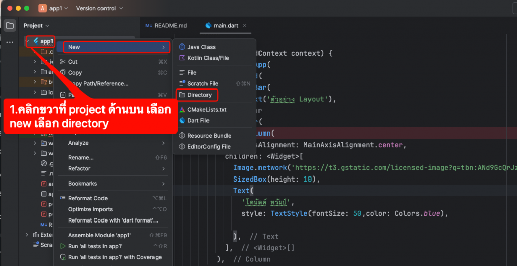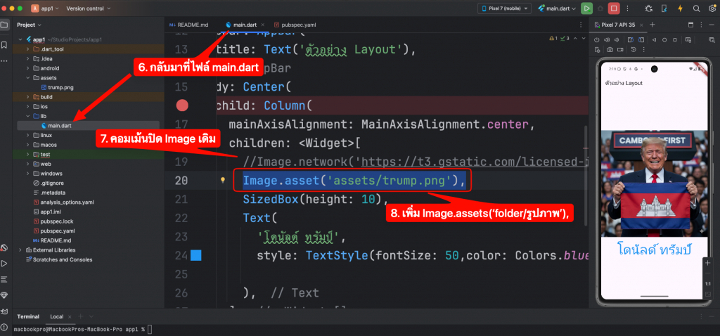 import 'package:flutter/material.dart'; void main() { runApp(MyApp()); } class MyApp extends StatelessWidget { @override Widget build(BuildContext context) { return MaterialApp( home: Scaffold( appBar: AppBar( title: Text('ตัวอย่าง Layout'), ), body: Center( child: Column( mainAxisAlignment: MainAxisAlignment.center, children: <Widget>[ Image.network('https://t3.gstatic.com/licensed-image?q=tbn:ANd9GcQrJzSTI4OI2aLe6DgXajqOO5E87Z3nGiTCZcn_-Q9xqZ_CLtLNLeYib4xxZUSGZgzb'), SizedBox(height: 10), Text( 'โดนัลด์ ทรัมป์', style: TextStyle(fontSize: 50,color: Colors.blue), ), ], ), ), ), ); } } - การเอาภาพไว้ในแอพและเรียกใช้งาน