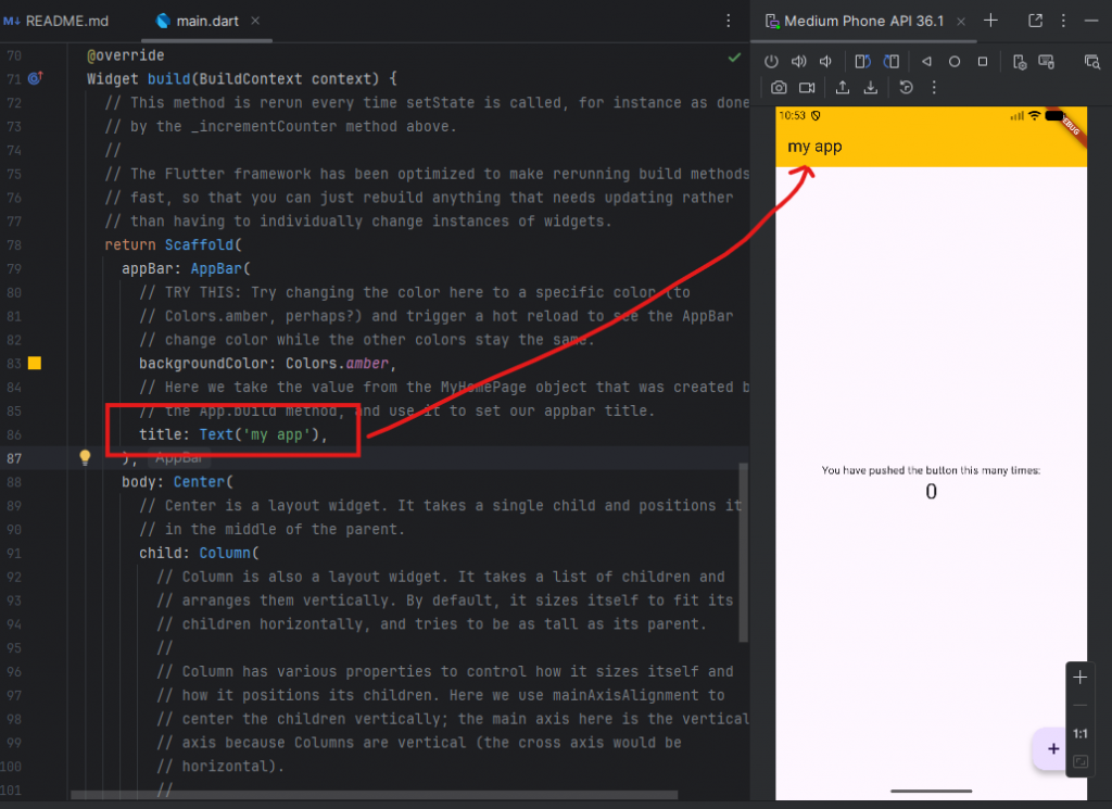 import 'package:flutter/material.dart'; void main() { runApp(const MyApp()); } class MyApp extends StatelessWidget { const MyApp({super.key}); // This widget is the root of your application. @override Widget build(BuildContext context) { return MaterialApp( title: 'Flutter Demo', theme: ThemeData( // This is the theme of your application. // // TRY THIS: Try running your application with "flutter run". You'll see // the application has a purple toolbar. Then, without quitting the app, // try changing the seedColor in the colorScheme below to Colors.green // and then invoke "hot reload" (save your changes or press the "hot // reload" button in a Flutter-supported IDE, or press "r" if you used // the command line to start the app). // // Notice that the counter didn't reset back to zero; the application // state is not lost during the reload. To reset the state, use hot // restart instead. // // This works for code too, not just values: Most code changes can be // tested with just a hot reload. colorScheme: .fromSeed(seedColor: Colors.deepPurple), ), home: const MyHomePage(title: 'Flutter Demo Home Page'), ); } } class MyHomePage extends StatefulWidget { const MyHomePage({super.key, required this.title}); // This widget is the home page of your application. It is stateful, meaning // that it has a State object (defined below) that contains fields that affect // how it looks. // This class is the configuration for the state. It holds the values (in this // case the title) provided by the parent (in this case the App widget) and // used by the build method of the State. Fields in a Widget subclass are // always marked "final". final String title; @override State<MyHomePage> createState() => _MyHomePageState(); } class _MyHomePageState extends State<MyHomePage> { int _counter = 0; void _incrementCounter() { setState(() { // This call to setState tells the Flutter framework that something has // changed in this State, which causes it to rerun the build method below // so that the display can reflect the updated values. If we changed // _counter without calling setState(), then the build method would not be // called again, and so nothing would appear to happen. _counter++;//+1 +1 }); } @override Widget build(BuildContext context) { // This method is rerun every time setState is called, for instance as done // by the _incrementCounter method above. // // The Flutter framework has been optimized to make rerunning build methods // fast, so that you can just rebuild anything that needs updating rather // than having to individually change instances of widgets. return Scaffold( appBar: AppBar( //comment คือพิมพ์ สแลชสองอันติดกัน backgroundColor: Colors.amber[300], // Here we take the value from the MyHomePage object that was created by // the App.build method, and use it to set our appbar title. title: Text('my app'), ), body: Center( child: Column( mainAxisAlignment: .center, children: [ const Text('สมโภชน์'), Text( 'กุลธารารมณ์', ), ], ), ), ); } } - ตัวอย่าง row และ column