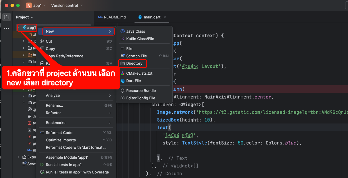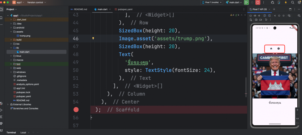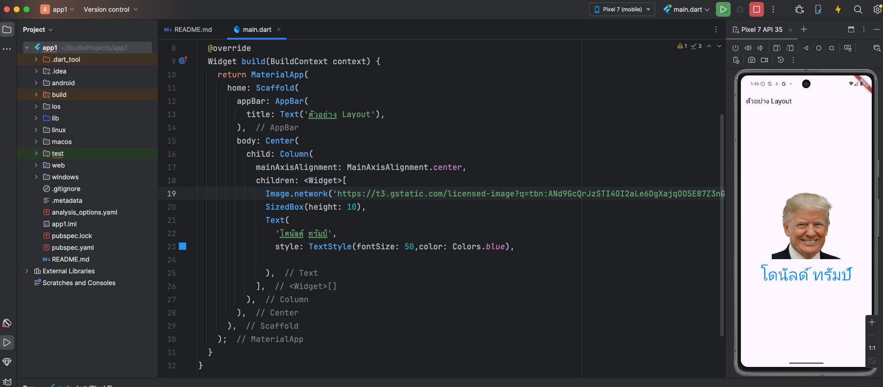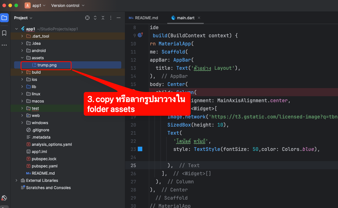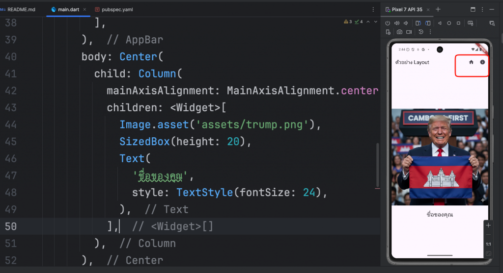 import 'package:flutter/material.dart'; void main() { runApp(MyApp()); } class MyApp extends StatelessWidget { @override Widget build(BuildContext context) { return MaterialApp( home: Scaffold( appBar: AppBar( title: Text('ตัวอย่าง Layout'), ), body: Center( child: Column( mainAxisAlignment: MainAxisAlignment.center, children: <Widget>[ Image.network('https://t3.gstatic.com/licensed-image?q=tbn:ANd9GcQrJzSTI4OI2aLe6DgXajqOO5E87Z3nGiTCZcn_-Q9xqZ_CLtLNLeYib4xxZUSGZgzb'), SizedBox(height: 10), Text( 'โดนัลด์ ทรัมป์', style: TextStyle(fontSize: 50,color: Colors.blue), ), ], ), ), ), ); } } - การเอาภาพไว้ในแอพและเรียกใช้งาน
