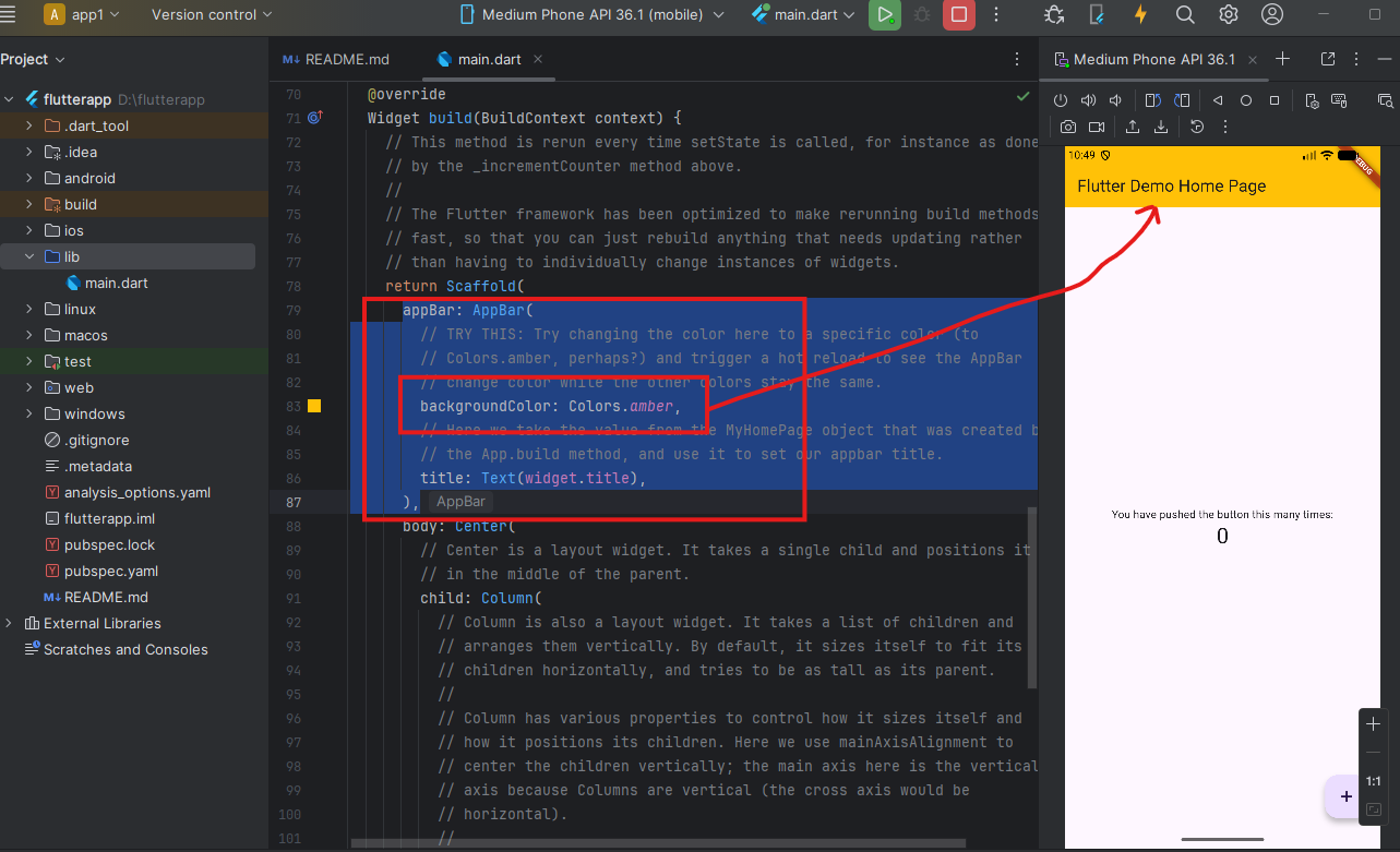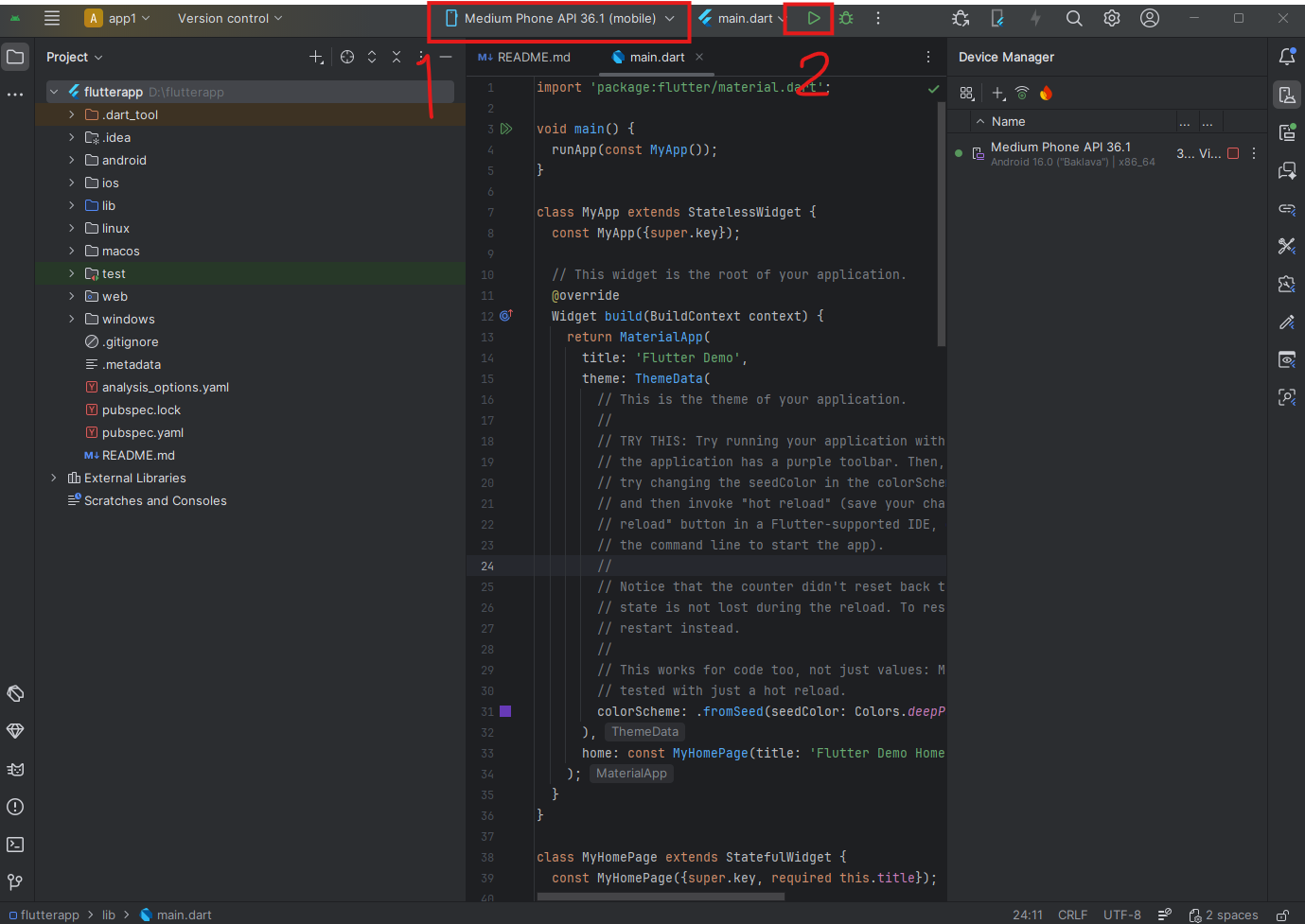 - เมื่อสร้าง app flutter แล้วให้ลองกดแสดงผล