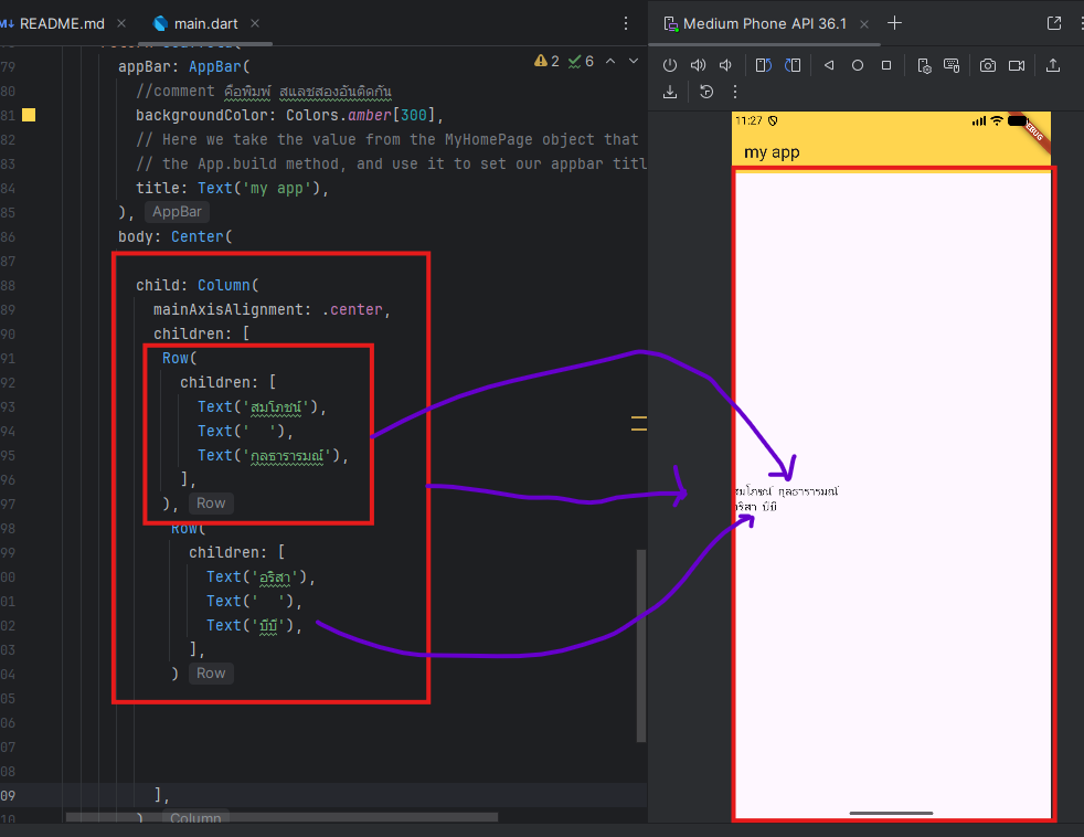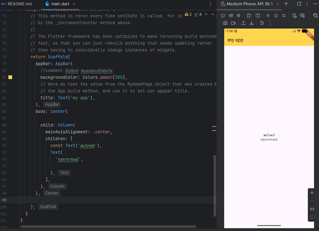 import 'package:flutter/material.dart'; void main() { runApp(const MyApp()); } class MyApp extends StatelessWidget { const MyApp({super.key}); // This widget is the root of your application. @override Widget build(BuildContext context) { return MaterialApp( title: 'Flutter Demo', theme: ThemeData( // This is the theme of your application. // // TRY THIS: Try running your application with "flutter run". You'll see // the application has a purple toolbar. Then, without quitting the app, // try changing the seedColor in the colorScheme below to Colors.green // and then invoke "hot reload" (save your changes or press the "hot // reload" button in a Flutter-supported IDE, or press "r" if you used // the command line to start the app). // // Notice that the counter didn't reset back to zero; the application // state is not lost during the reload. To reset the state, use hot // restart instead. // // This works for code too, not just values: Most code changes can be // tested with just a hot reload. colorScheme: .fromSeed(seedColor: Colors.deepPurple), ), home: const MyHomePage(title: 'Flutter Demo Home Page'), ); } } class MyHomePage extends StatefulWidget { const MyHomePage({super.key, required this.title}); // This widget is the home page of your application. It is stateful, meaning // that it has a State object (defined below) that contains fields that affect // how it looks. // This class is the configuration for the state. It holds the values (in this // case the title) provided by the parent (in this case the App widget) and // used by the build method of the State. Fields in a Widget subclass are // always marked "final". final String title; @override State<MyHomePage> createState() => _MyHomePageState(); } class _MyHomePageState extends State<MyHomePage> { int _counter = 0; void _incrementCounter() { setState(() { // This call to setState tells the Flutter framework that something has // changed in this State, which causes it to rerun the build method below // so that the display can reflect the updated values. If we changed // _counter without calling setState(), then the build method would not be // called again, and so nothing would appear to happen. _counter++;//+1 +1 }); } @override Widget build(BuildContext context) { // This method is rerun every time setState is called, for instance as done // by the _incrementCounter method above. // // The Flutter framework has been optimized to make rerunning build methods // fast, so that you can just rebuild anything that needs updating rather // than having to individually change instances of widgets. return Scaffold( appBar: AppBar( //comment คือพิมพ์ สแลชสองอันติดกัน backgroundColor: Colors.amber[300], // Here we take the value from the MyHomePage object that was created by // the App.build method, and use it to set our appbar title. title: Text('my app'), ), body: Center( child: Column( mainAxisAlignment: .center, children: [ const Text('สมโภชน์'), Text( 'กุลธารารมณ์', ), ], ), ), ); } } - ตัวอย่าง row และ column